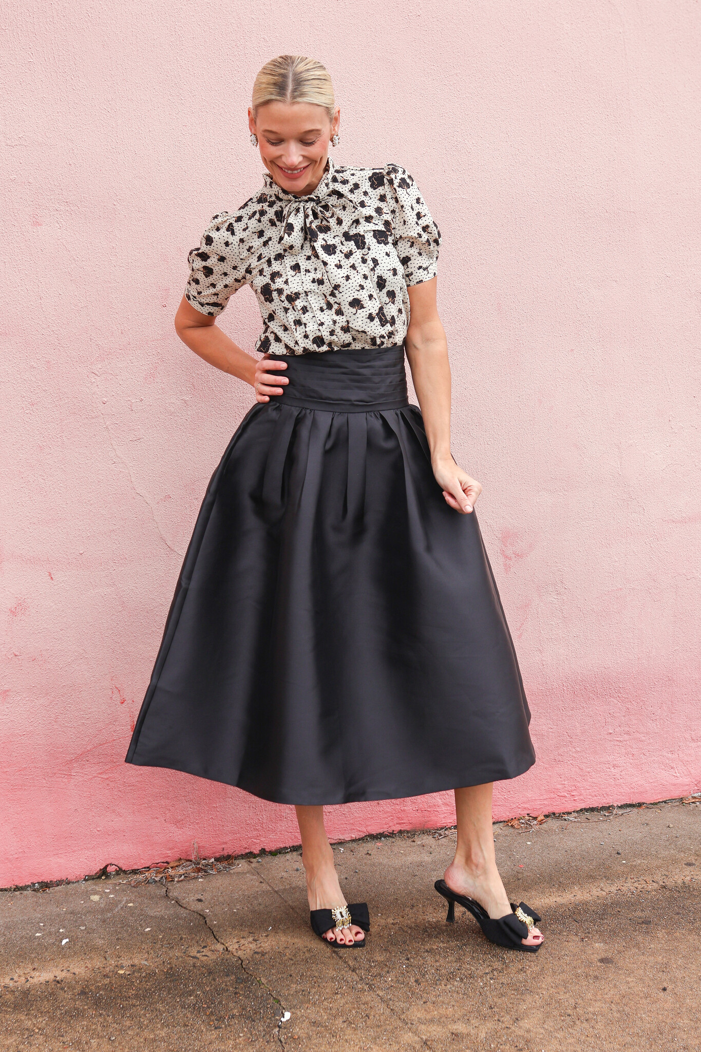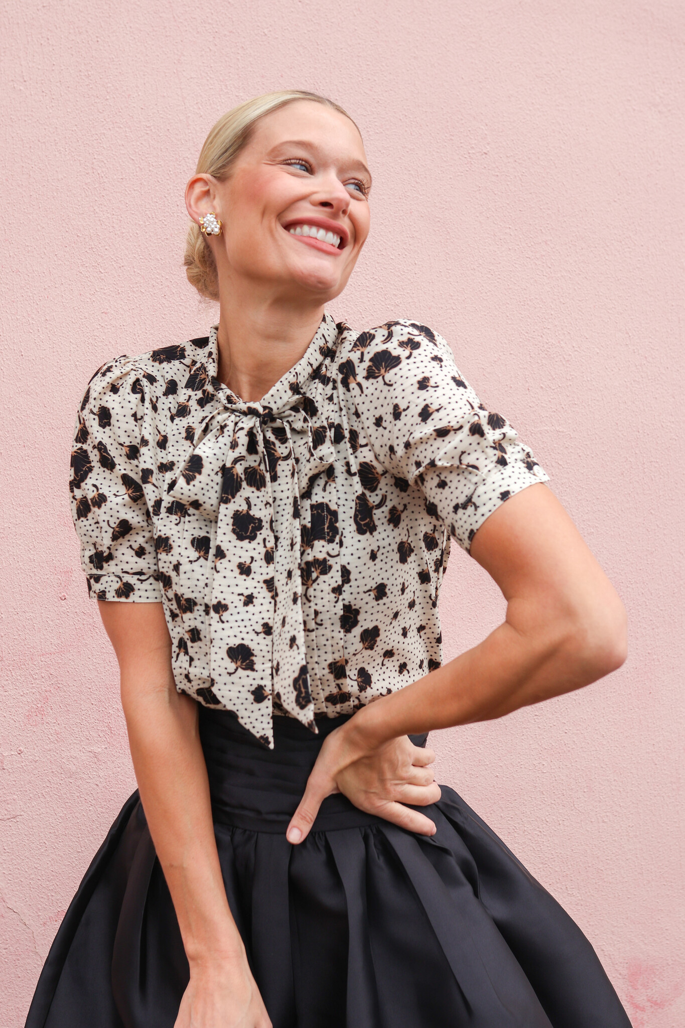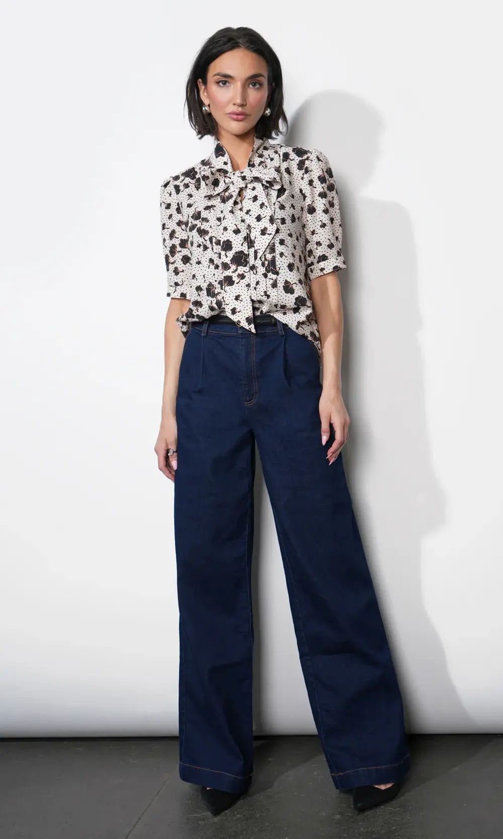 • It features distinct design elements: elegant short puff sleeves that add volume to the shoulders and a sophisticated scarf neckline that can be tied into a bow or left draped.