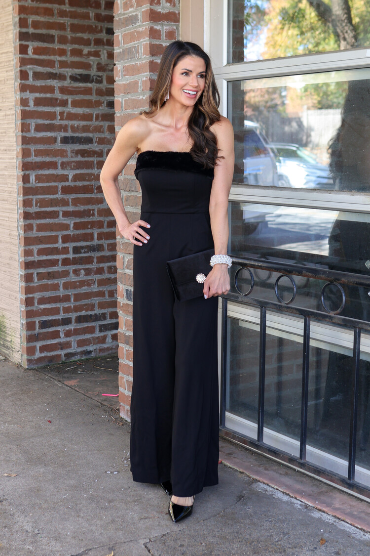 • Gorgeous strapless jumpsuit with faux fur trim bodice.