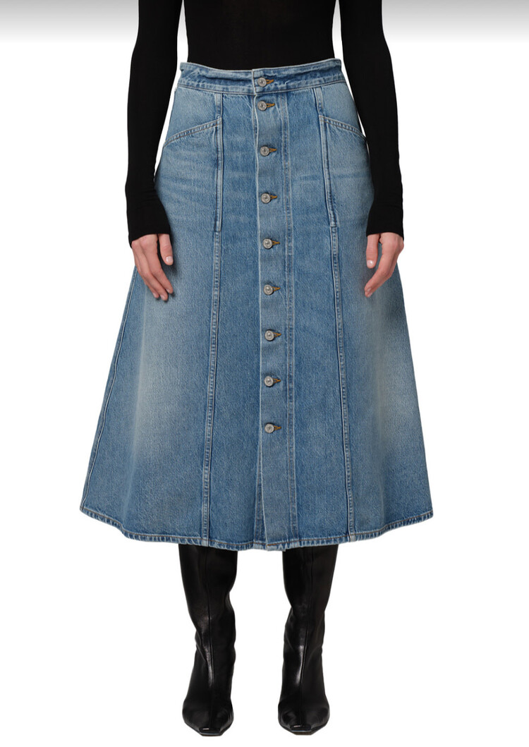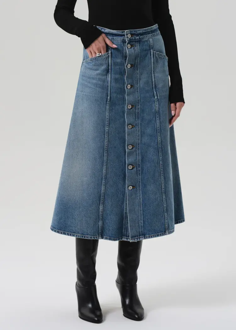 • The ‘Devin’ is an A-line skirt cut from weightless, non-stretch denim made with 100% regenerative cotton for a soft, broken-in feel. Featuring a button front and utility-style pockets, the silhouette is clean and easy.