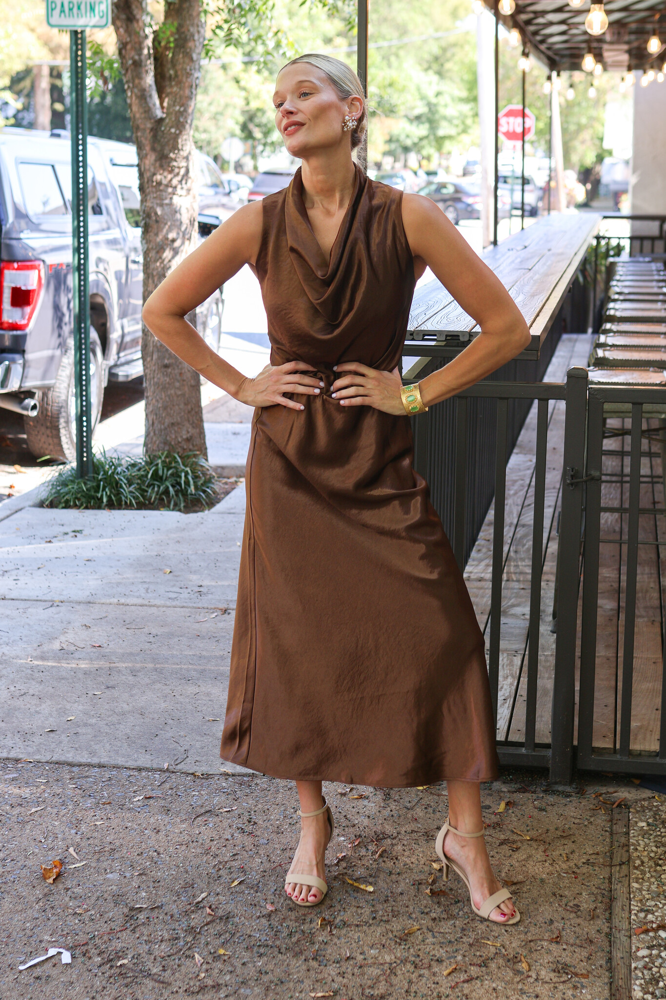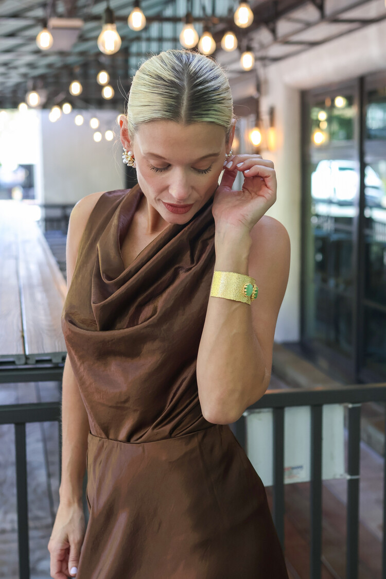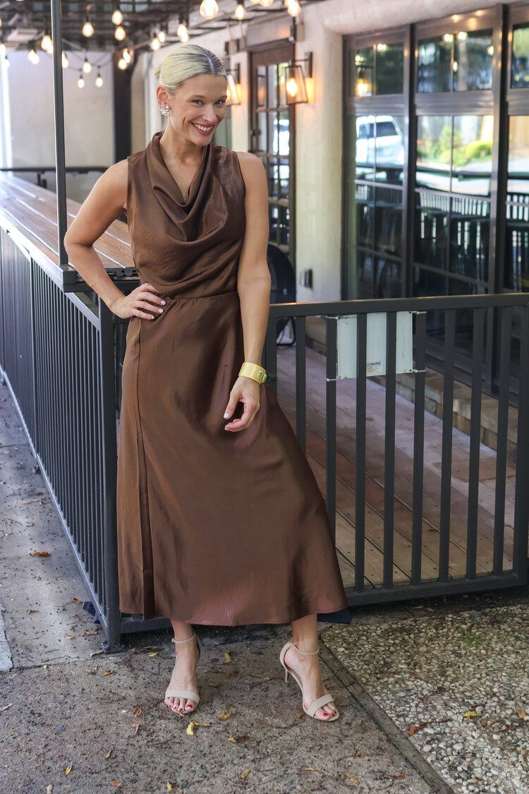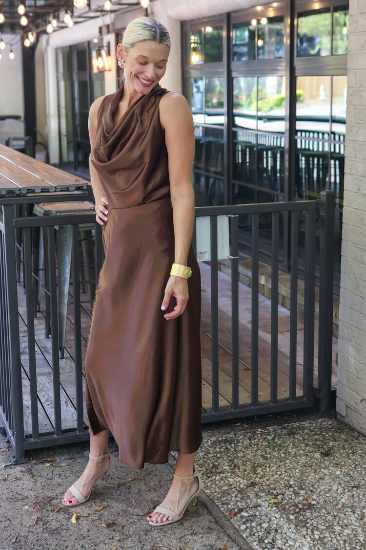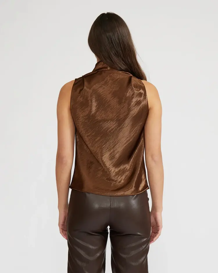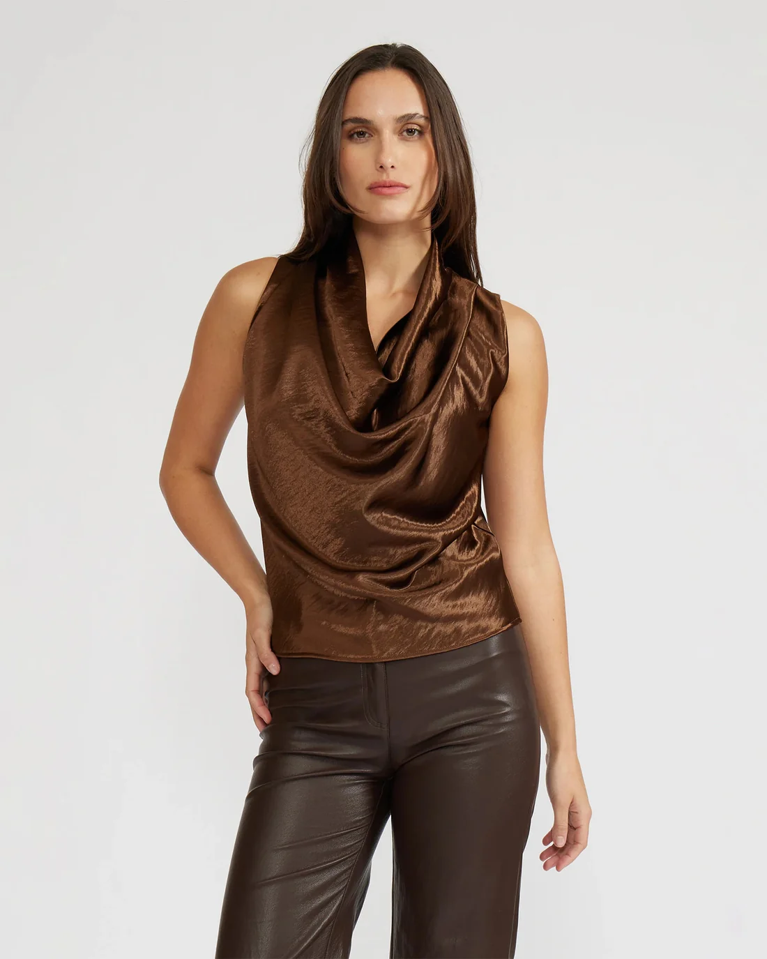 • You'll turn heads in this going-out top! It elegantly drapes your figure with a timeless cowl neck in a satin that catches light as you move. Pair with sleek trousers or the matching skirt, and add a martini for a good time!