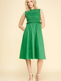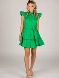 This dress features color print block, ruffle flutter sleeves, cinched waist with elastic, button down placket closure at bodice, round neckline, side pockets, lining, and tiered skirt. The ideal dress for weddings, garden parties, or everyday wear.