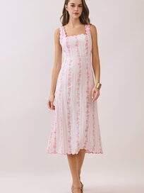 Ahoy, fashion mate! This seersucker stunner features charming rope straps, a square neckline, criss cross straps on the back, and a navy blue grosgrain ribbon trim along the hem. Perfect for soirées, seaside strolls, or just pretending you're on a yacht.