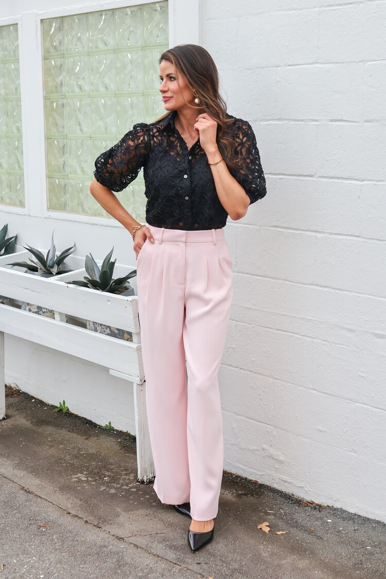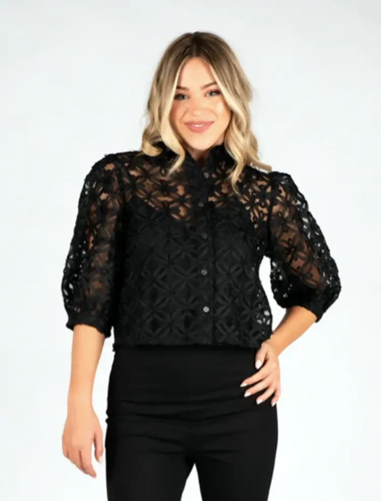 • This sophisticated button-up features delicate lace detailing with practical 3/4 sleeves in luxurious black organza. Perfect for the modern professional, it effortlessly transitions from office to evening occasions.