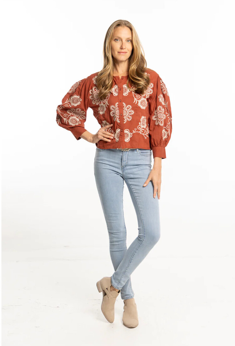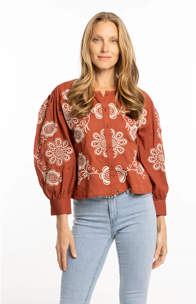 • The Egla Blouse in Terracotta captures the essence of effortless autumn elegance. Crafted from pure cotton in a slightly heavier weight, this blouse is adorned with intricate embroidery that adds depth, texture, and timeless charm.
