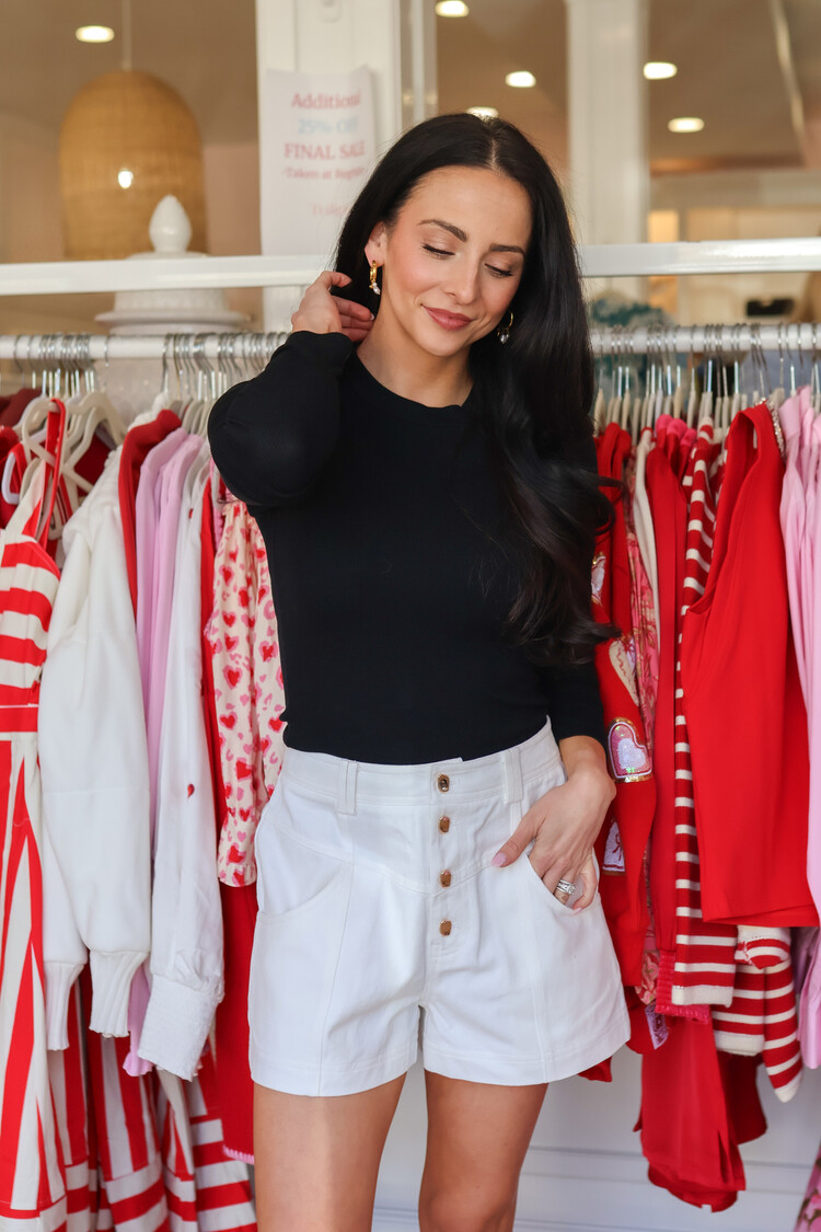 • The Eira Denim Short is a tailored white bottom with a multi gold button front.