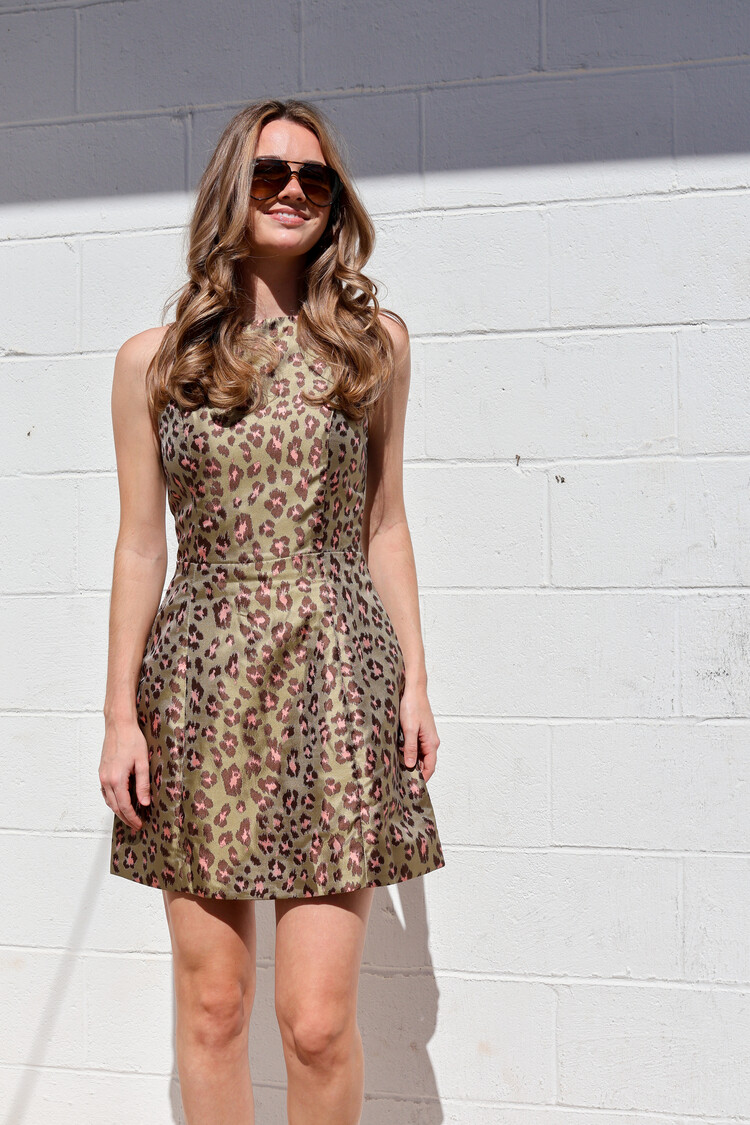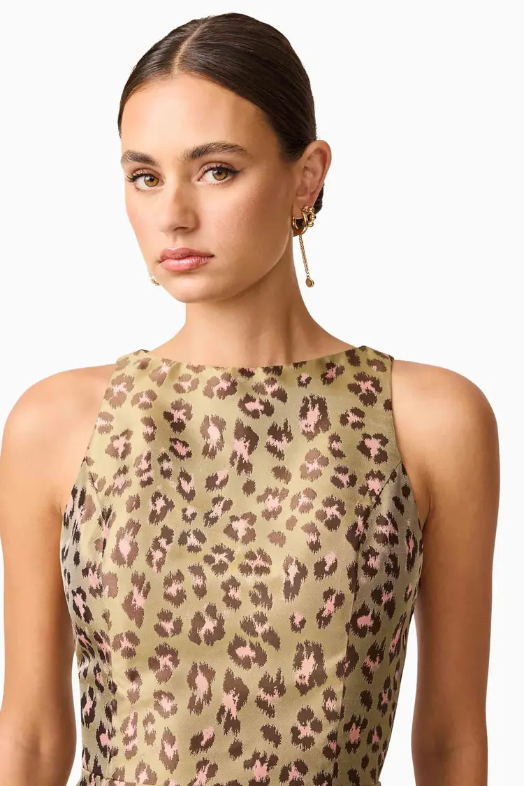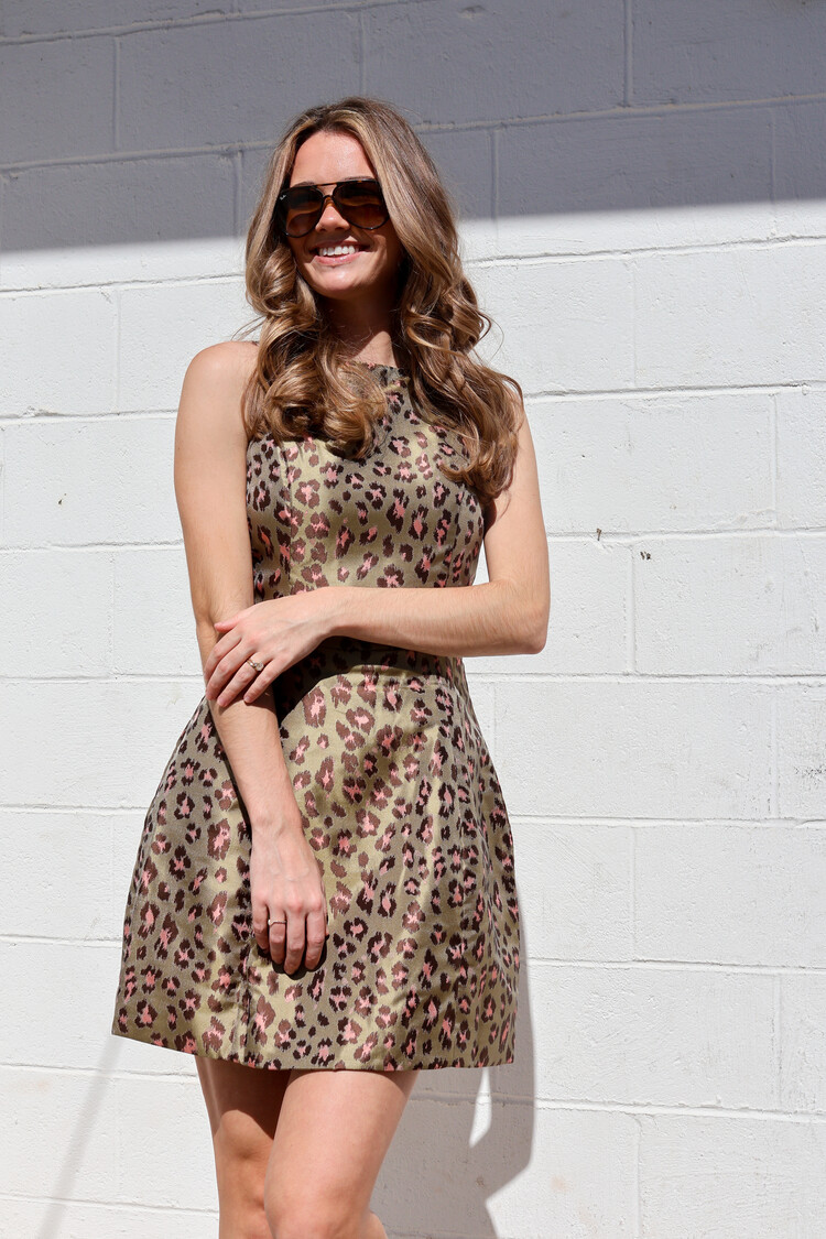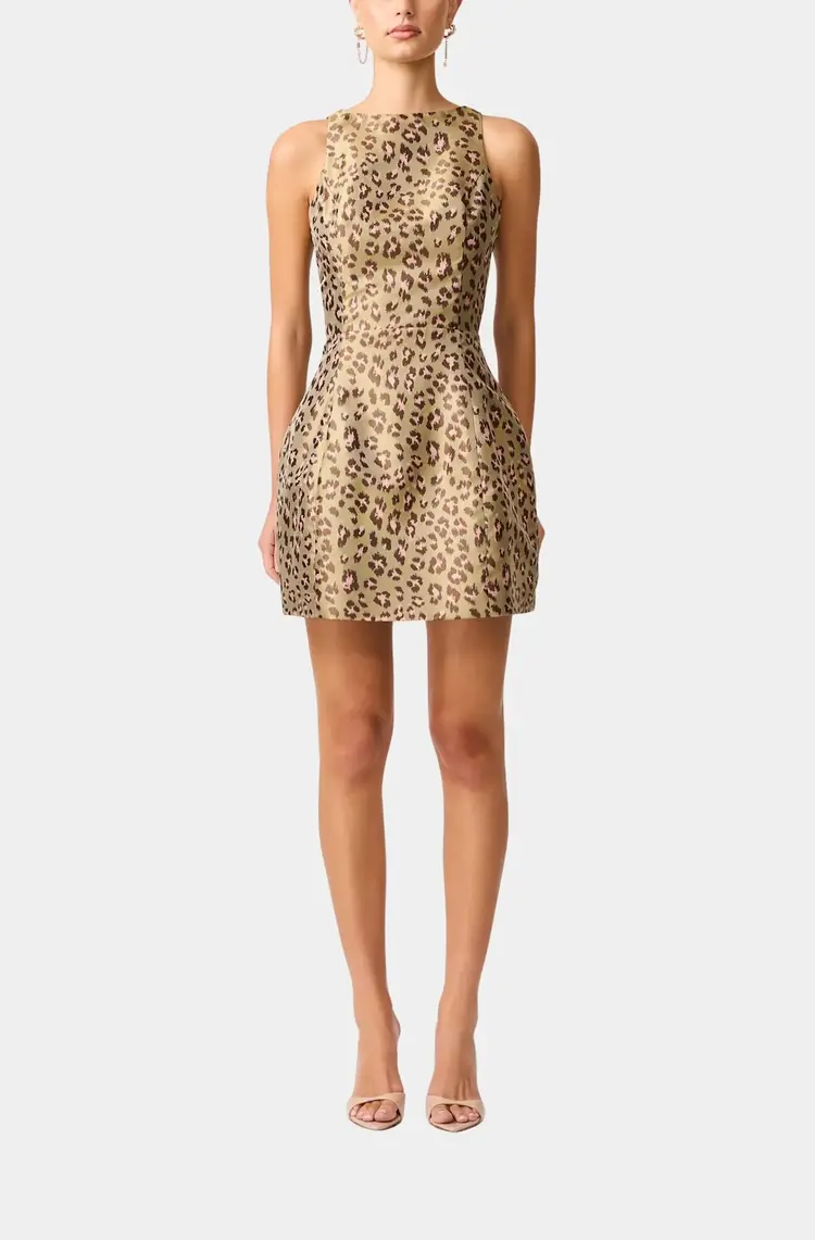 • Flaunt your wild side with the Elara Tulip Dress— a sultry, structured silhouette designed for effortless sophistication. Cut from a sateen fabrication, this mini dress offers a sleek, polished look with a slight sheen that elevates the bold leopard print