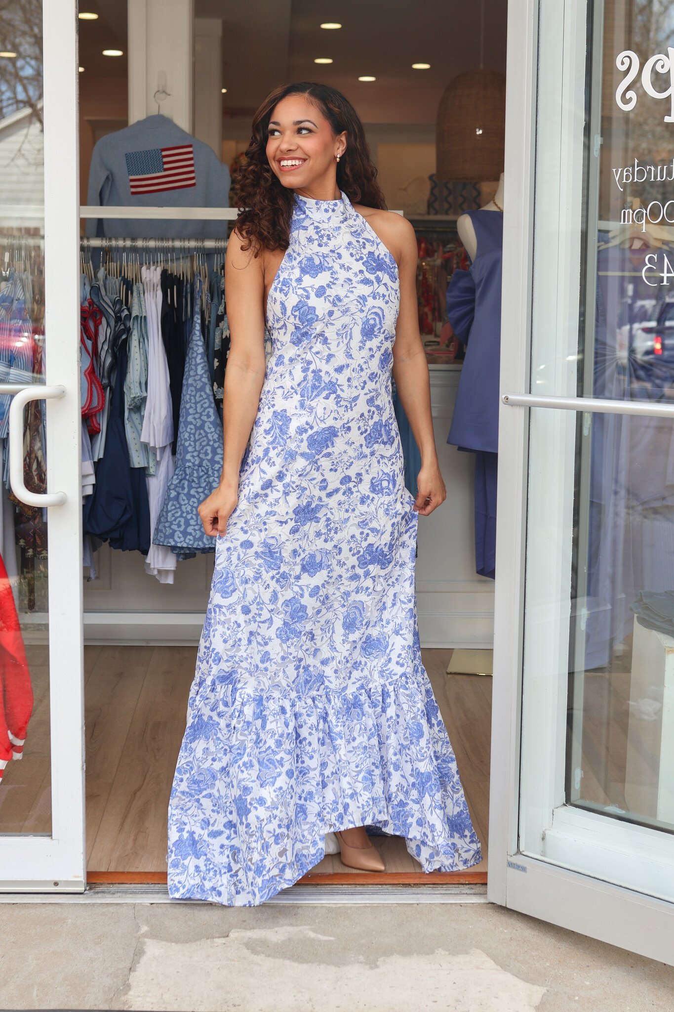 The ELLIATT Elin Halter Gown presents an exquisite silhouette with a blue and white floral motif that captures understated luxury. Designed with a high neckline and halter construction, this gown offers elegant support and refined proportions.