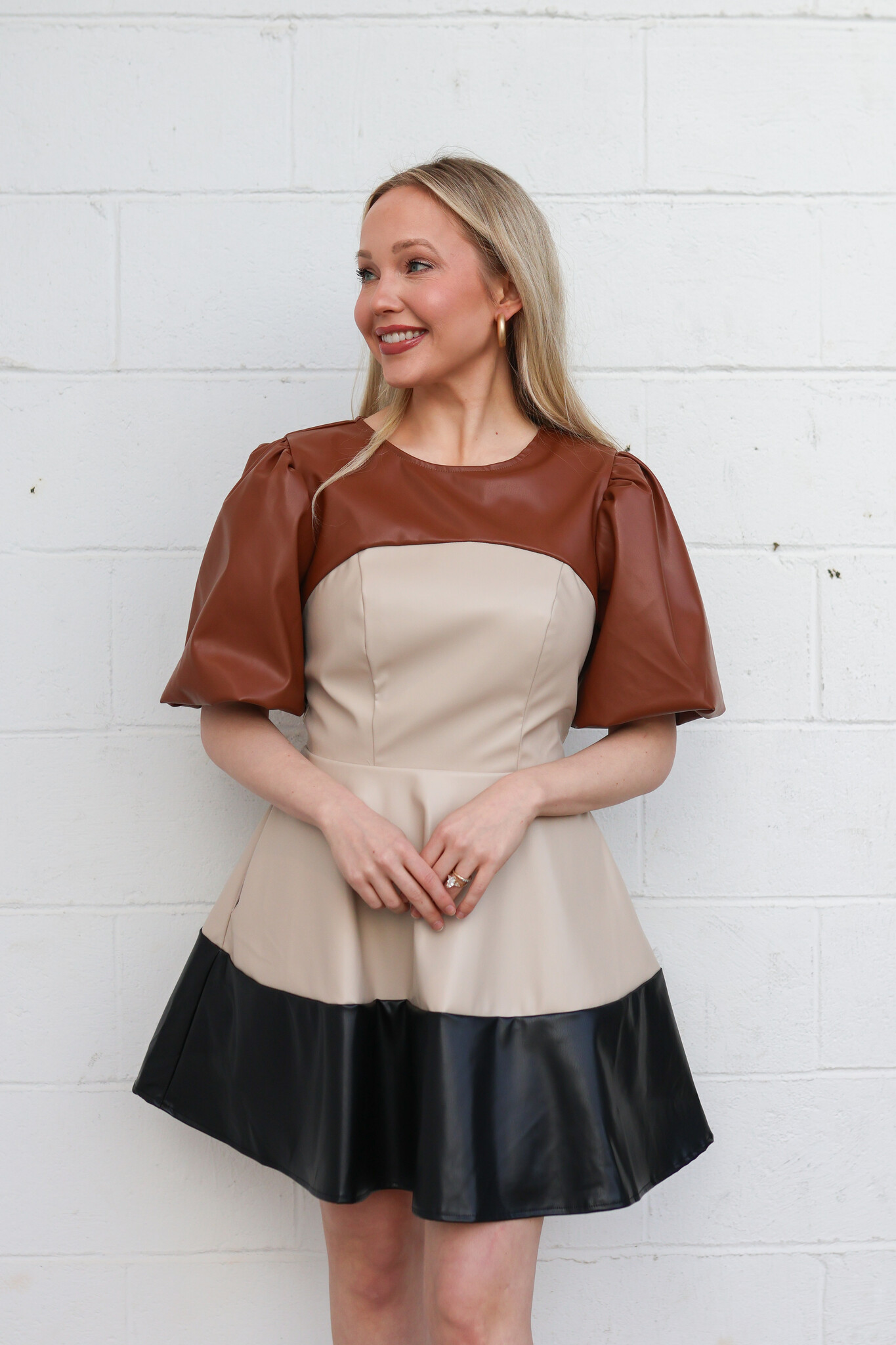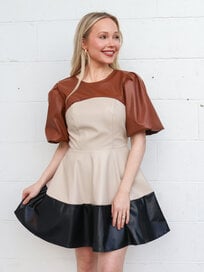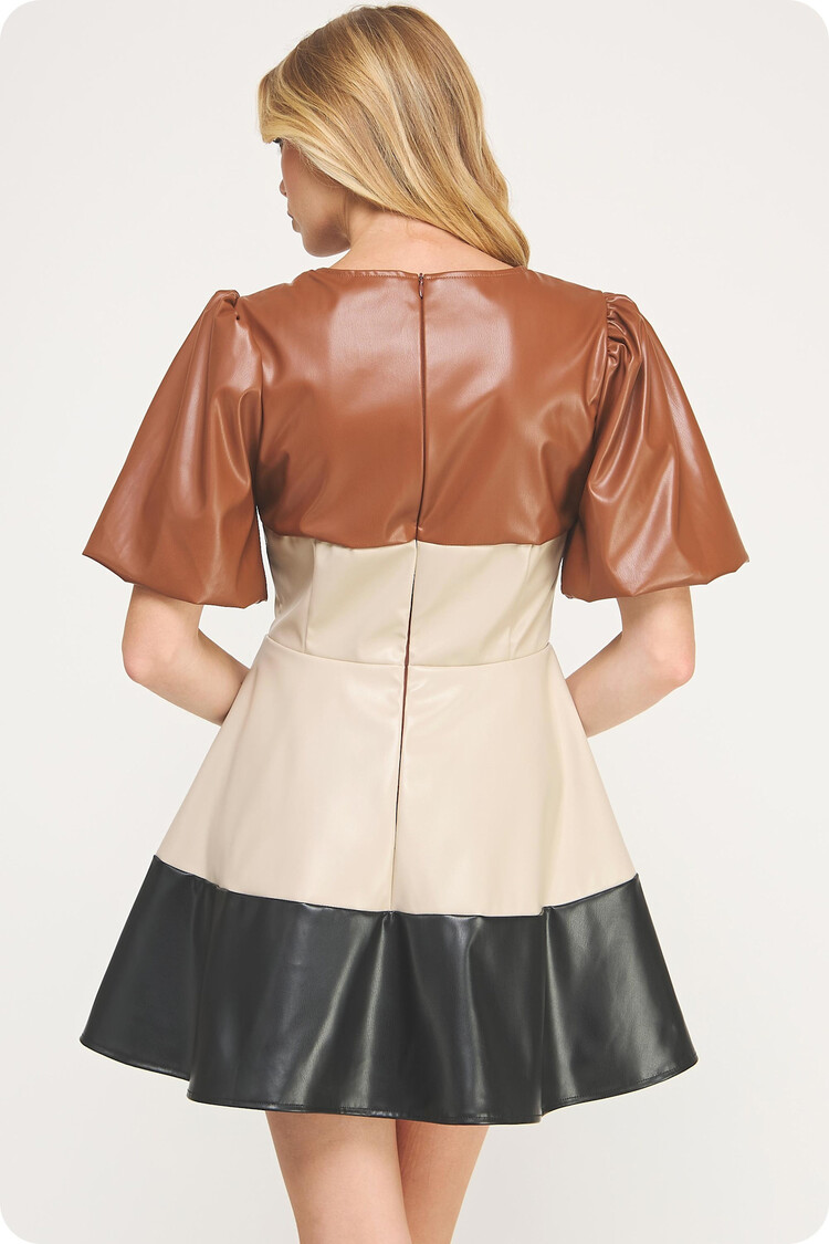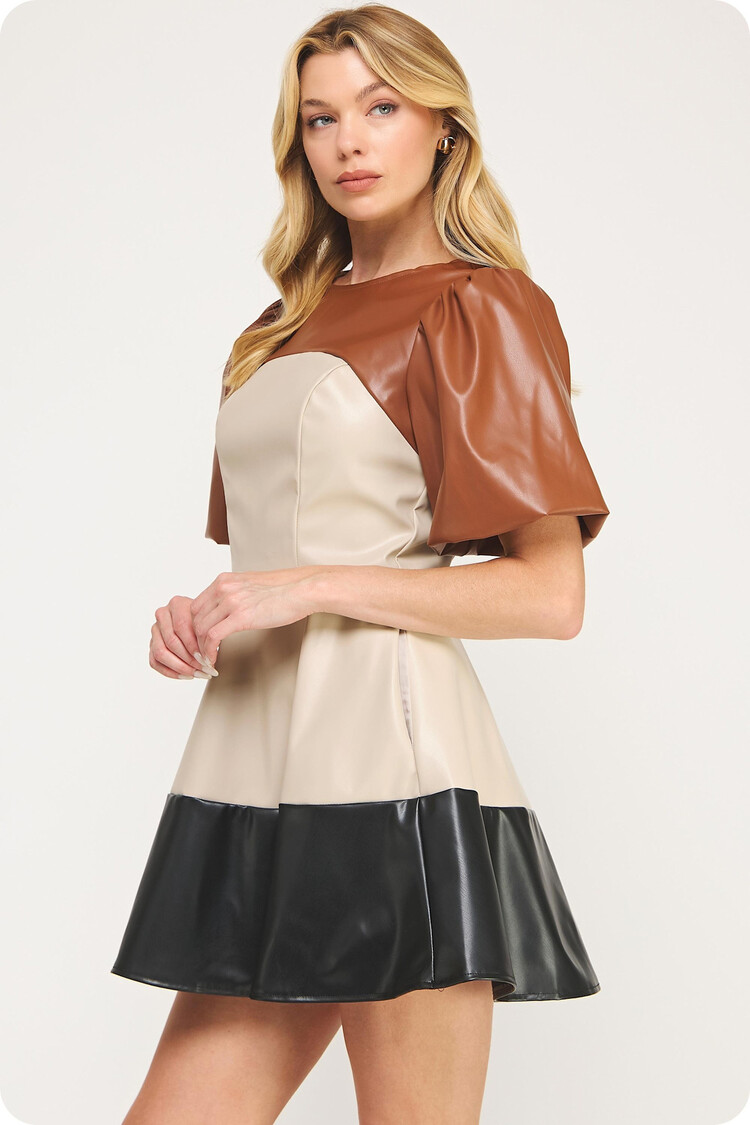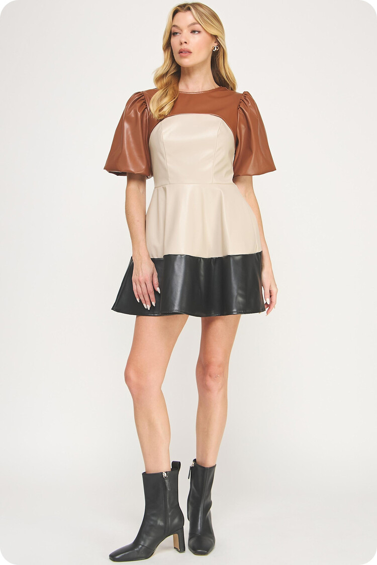 Puff short sleeve tiered mini dress in faux leather fabric. This style features shirred shoulders, short puff sleeve, round neck, cinched waist, side pockets, tiered mini skirt, and hidden zipper closure.