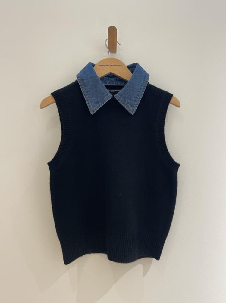 The Ellie Collared Vest makes layering effortless. This crewneck sweater vest features a removable denim shirt collar for that perfectly styled look. Easy to throw on with jeans or trousers, it’s an instant outfit-maker with a touch of contrast.
