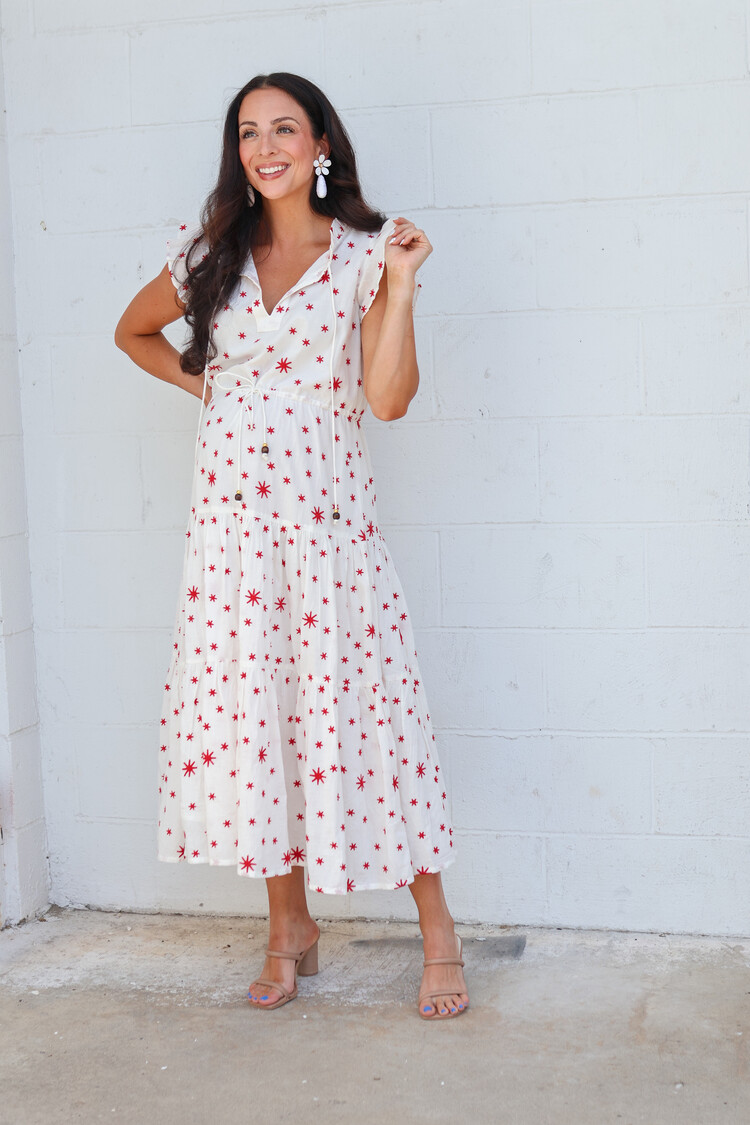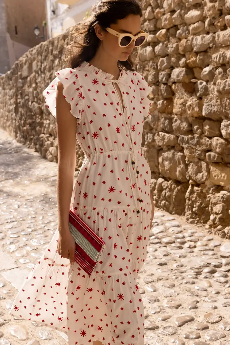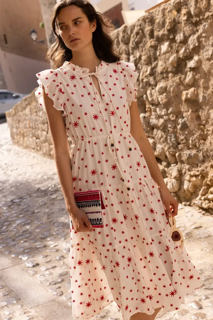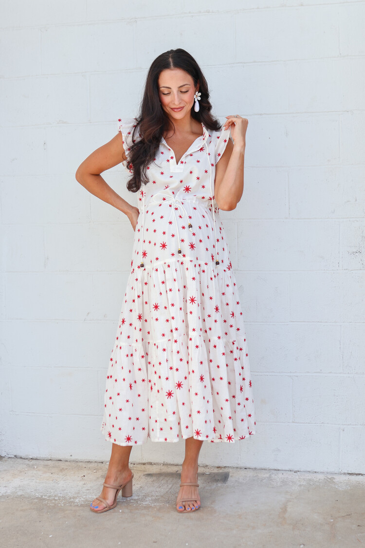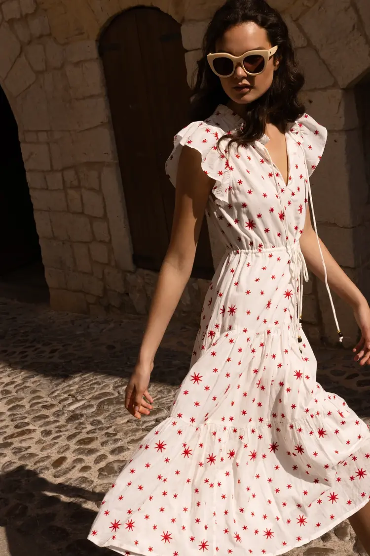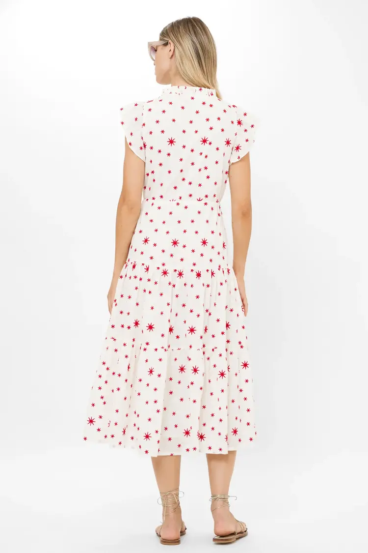 • The feminine silhouette of the Cinched Flirty Midi makes this our go to day dress. An intricately embroidered starry print plays across airy Cotton Voile, while the cinching tie waist allows you to tailor your perfect fit!