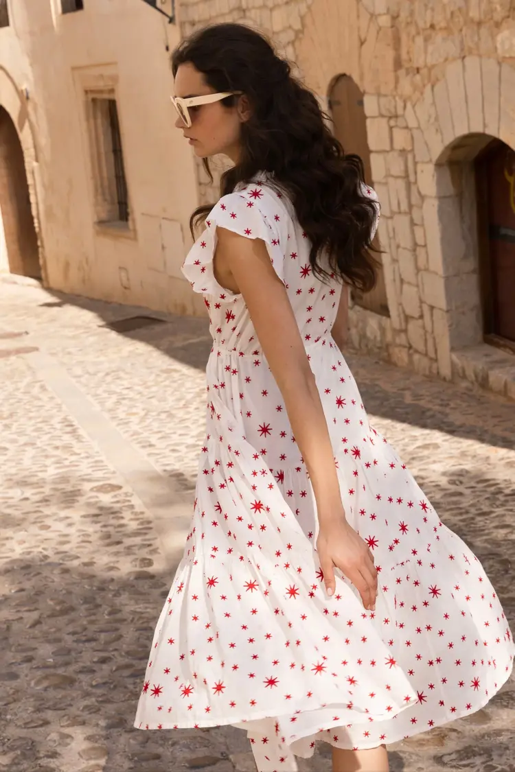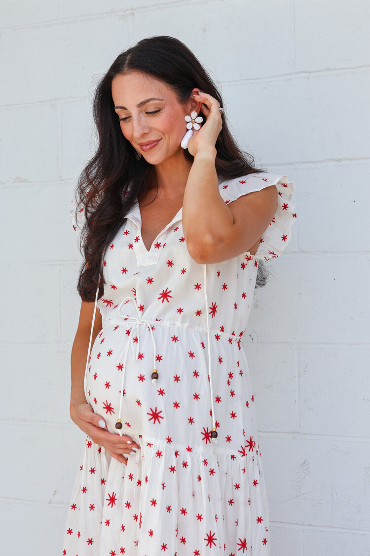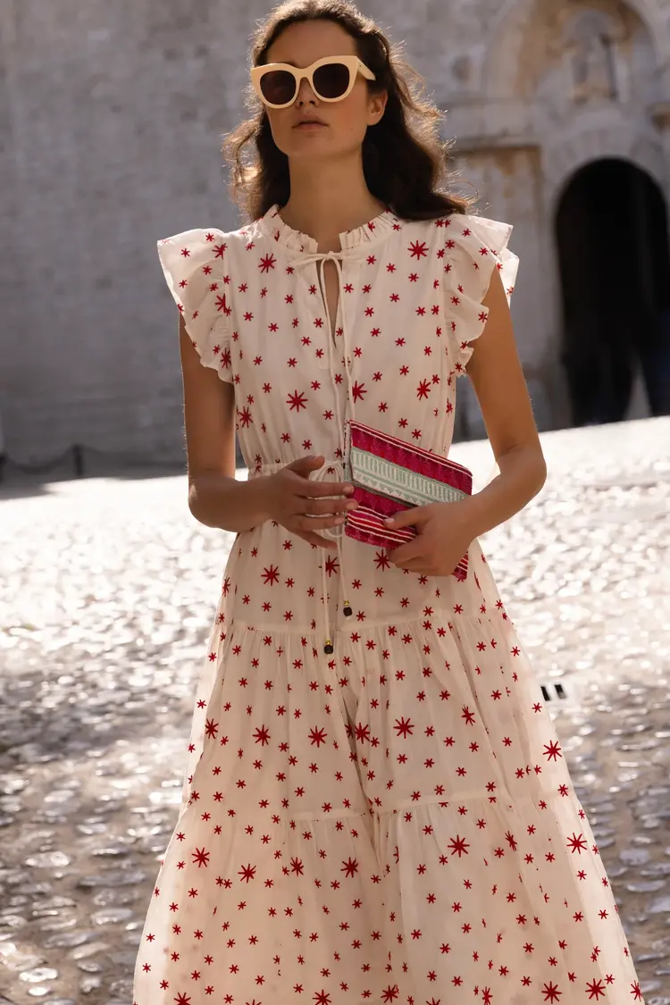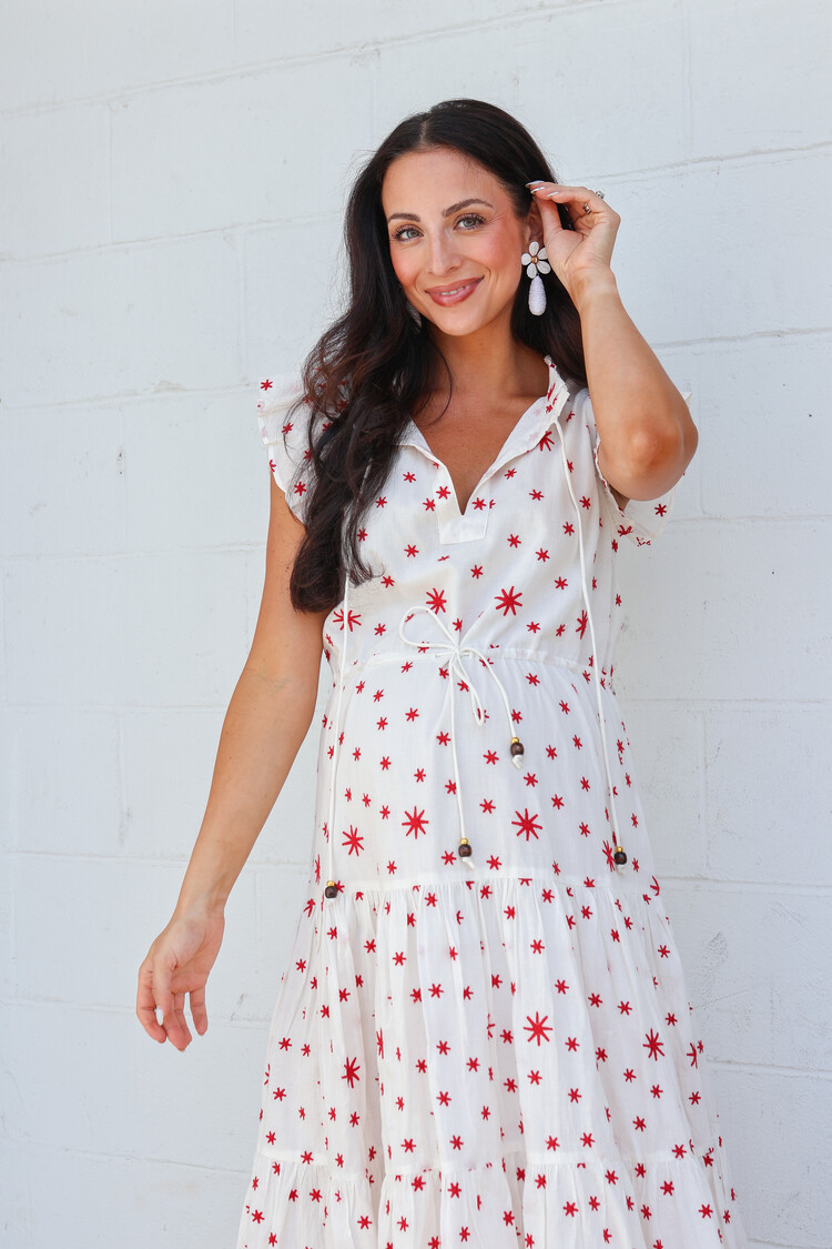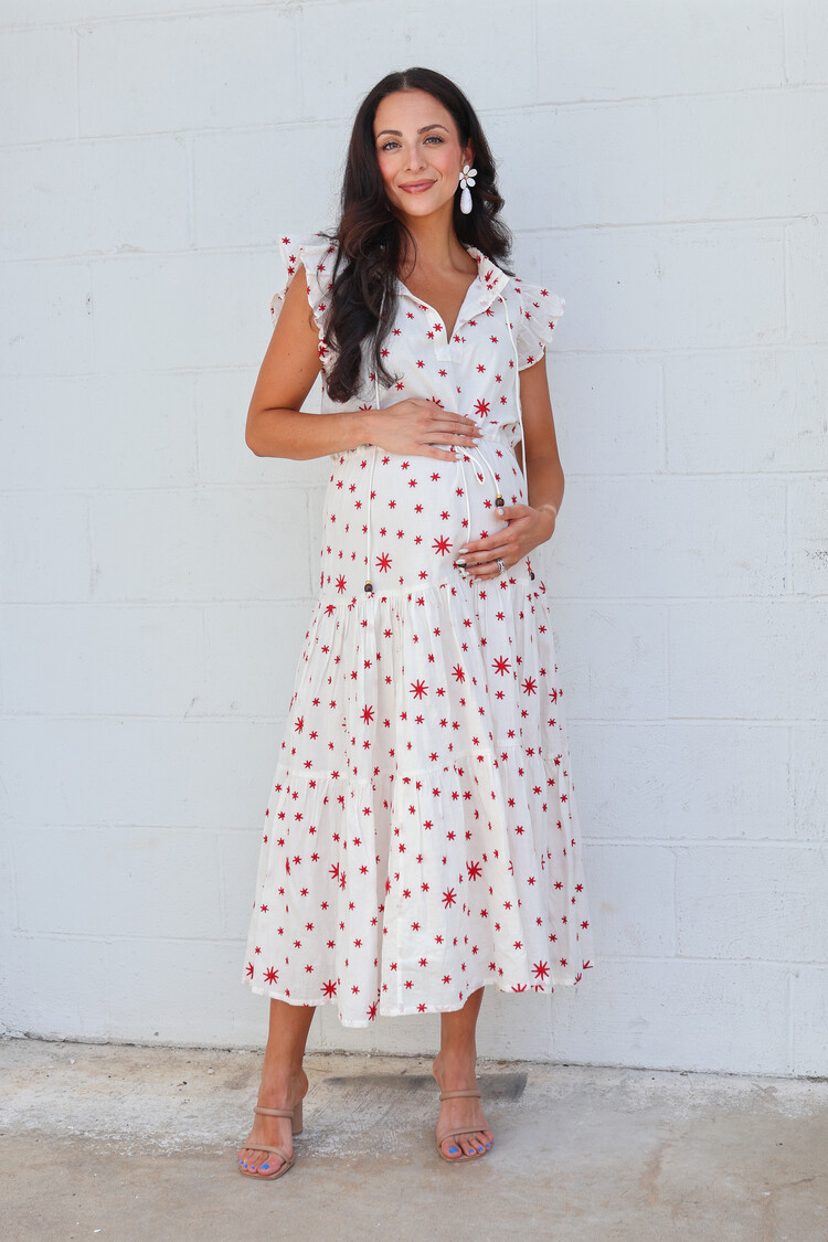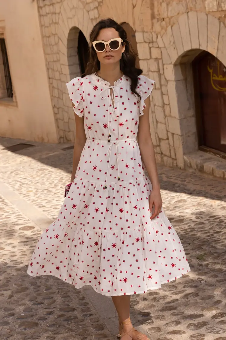 • The feminine silhouette of the Cinched Flirty Midi makes this our go to day dress. An intricately embroidered starry print plays across airy Cotton Voile, while the cinching tie waist allows you to tailor your perfect fit!
