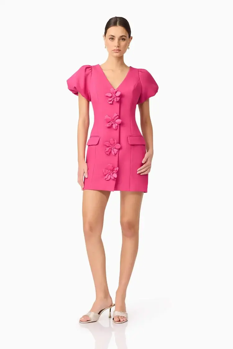• The Elysie Blazer Dress is the epitome of chic, modern elegance. Featuring a bold V-neckline and structured puff sleeves, this dress seamlessly combines the timeless appeal of a blazer with the feminine touch of a mini dress.