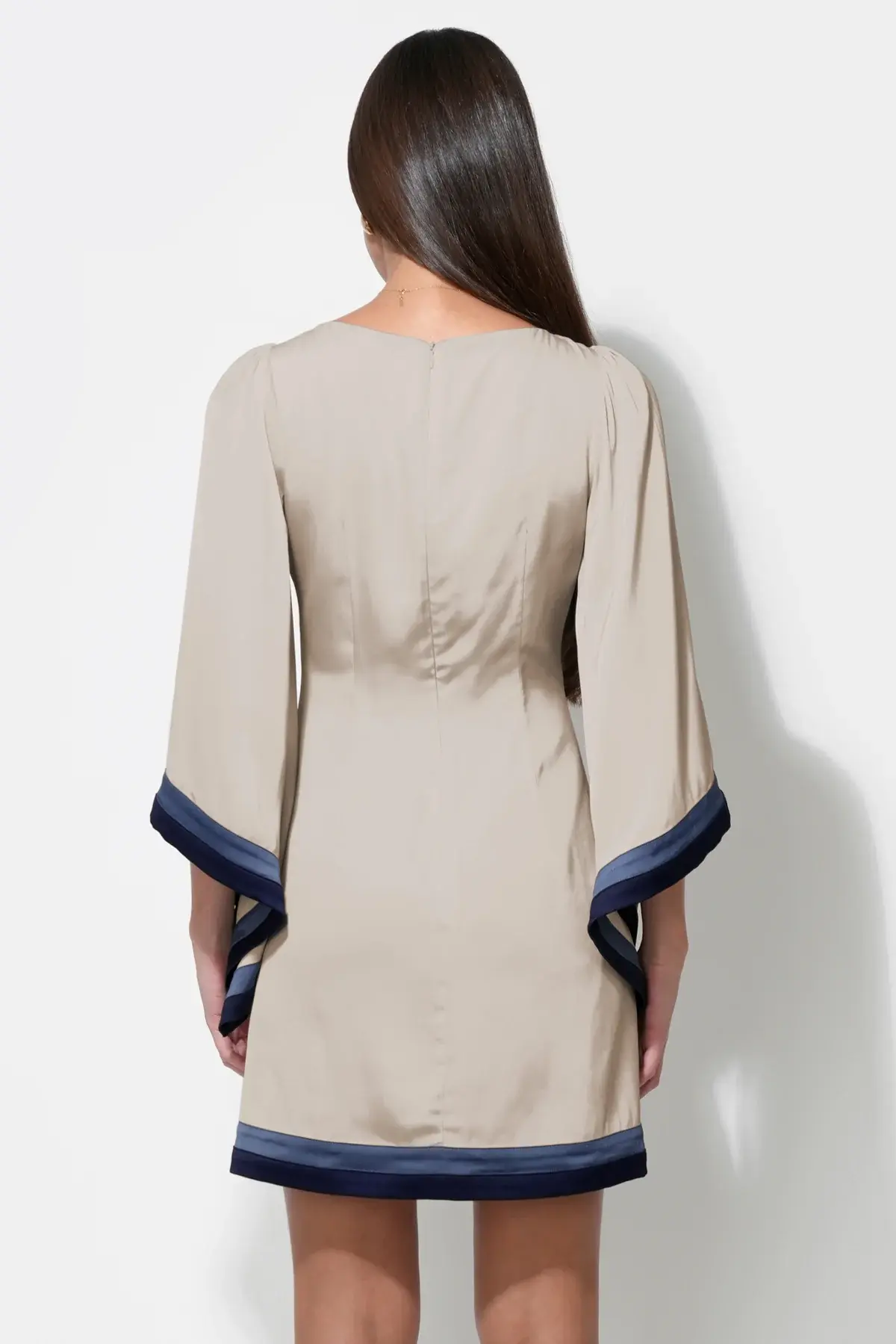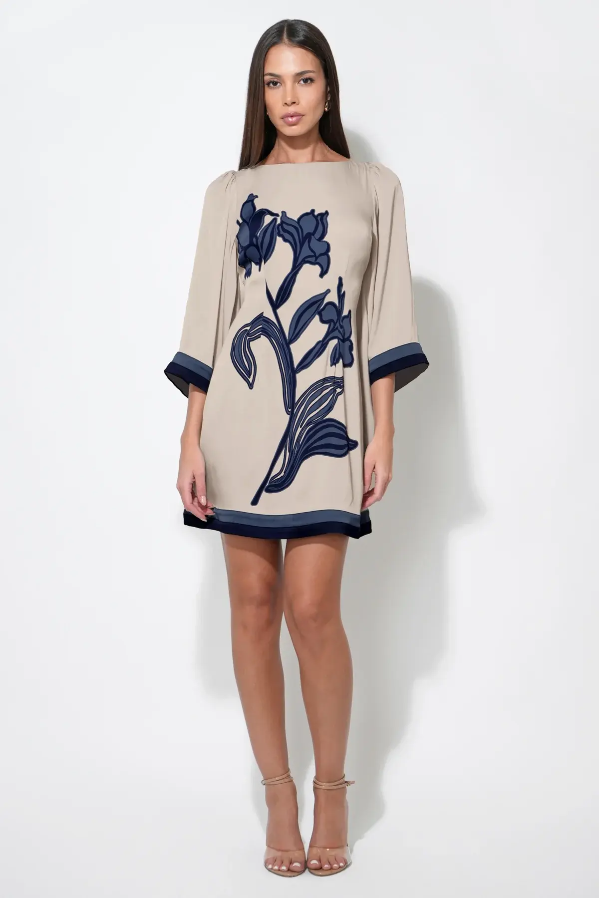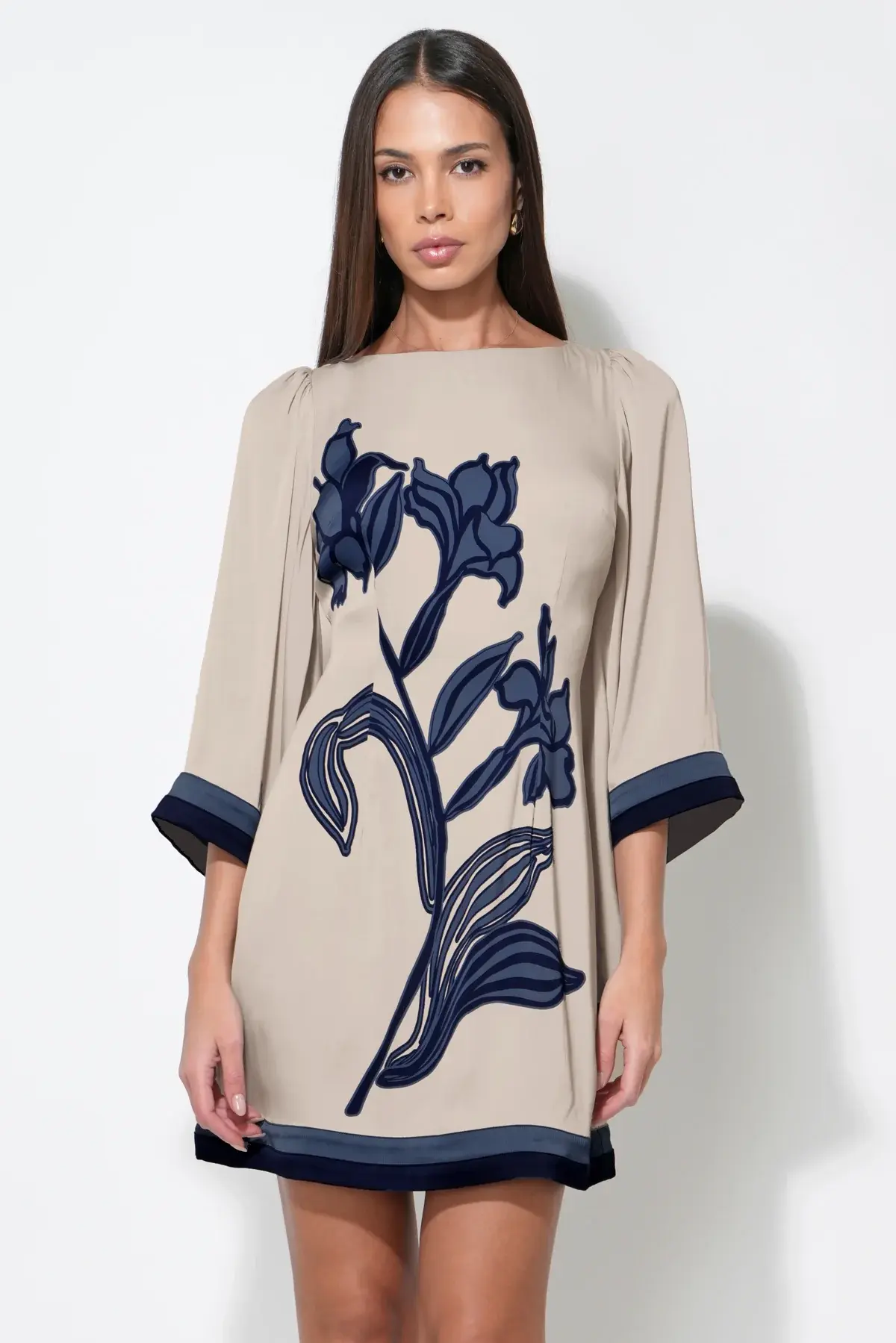 • This dress showcases a pattern of flowers set against a contrasting background, utilizing a Beige and Navy color palette for a sophisticated look. The silhouette is a flirty mini dress length, balanced by romantic bell sleeves that add volume and movement