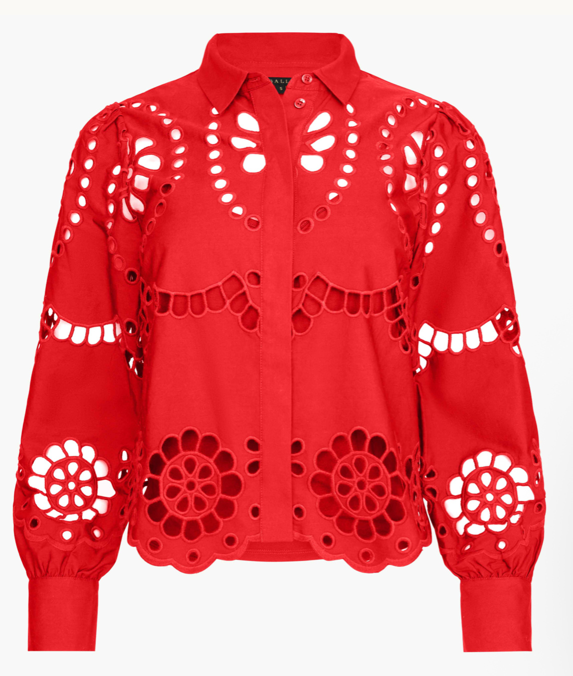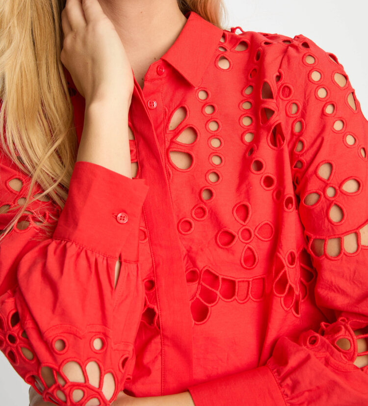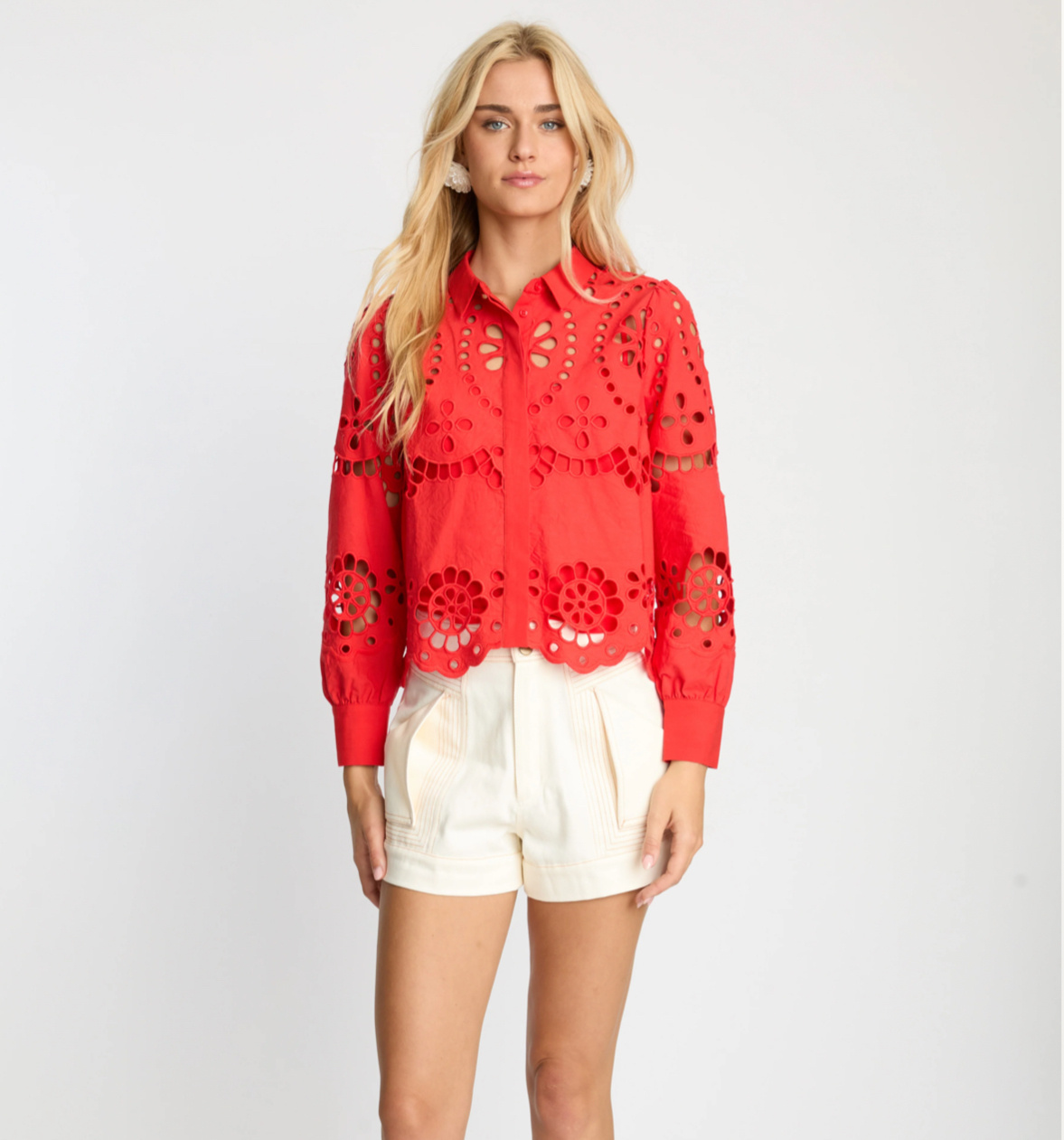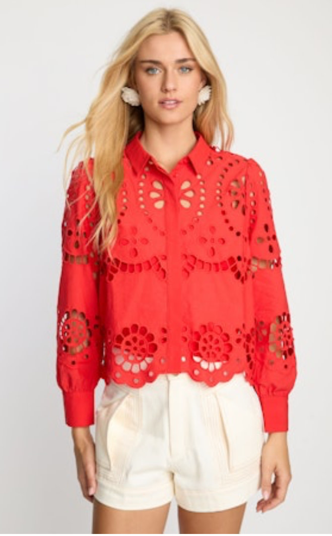 • Make a statement in our Emmie Top in Poppy Red Eyelet Lace. Made from cotton, this top offers a delicate, floral-inspired design with a subtle peek of skin.
