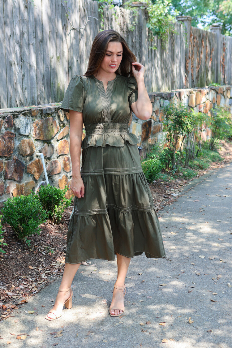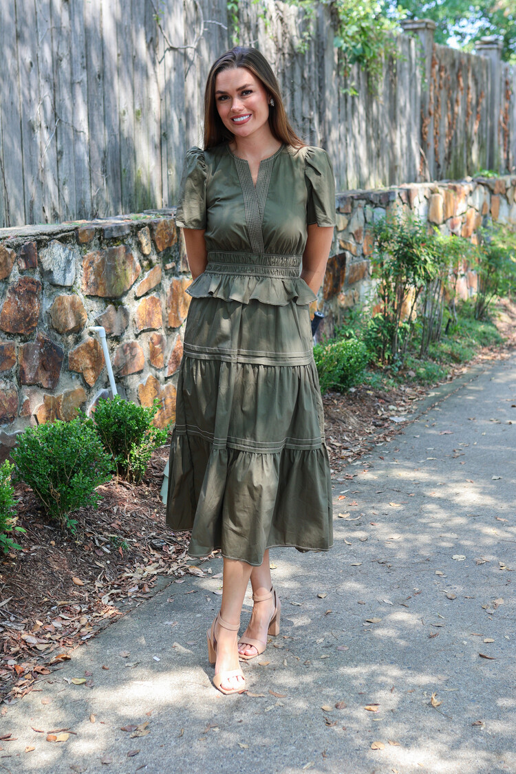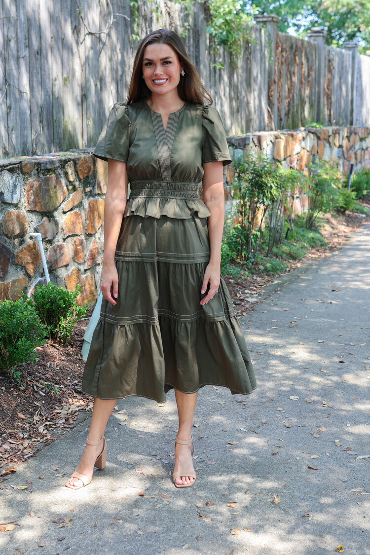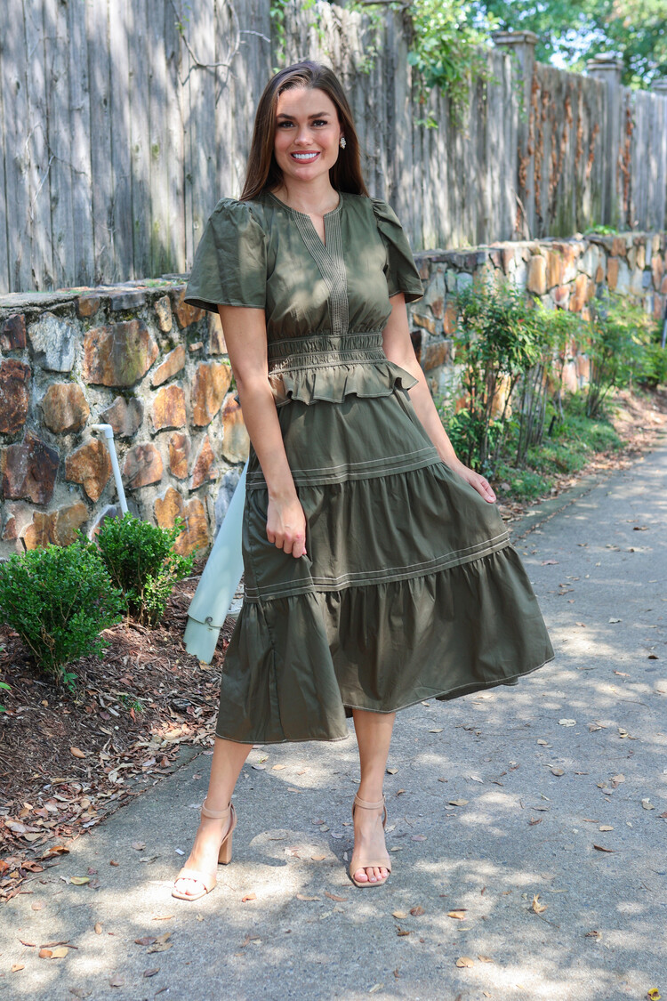 This charming olive dress showcases an pink print & a flattering belted waist. The neckline and short sleeves add a classic touch, making it effortlessly polished. With its warm tones & easy silhouette, it’s the perfect piece for fall outings or brunch.