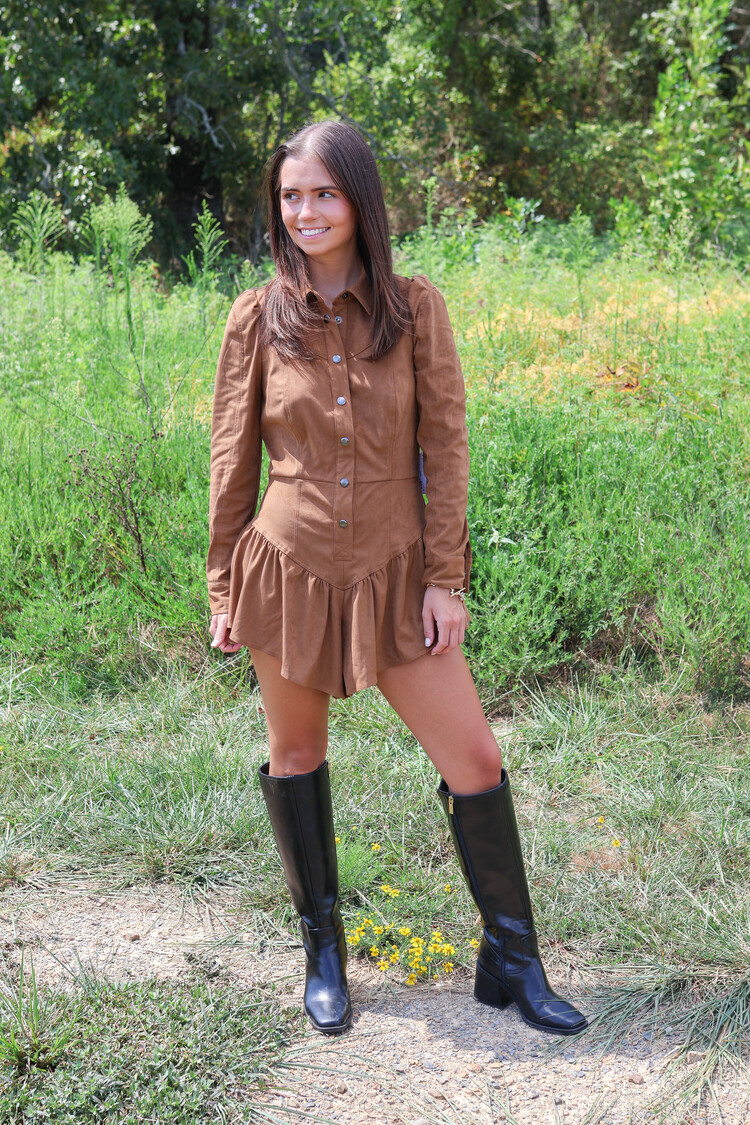 • Our Enid romper is ready for the rodeo. The romper is made from a soft faux suede. The long sleeve piece has buttons down the front, a collar, puff shoulders, and fluttery shorts. Pair Enid with your favorite boots for a cowgirl inspired look.