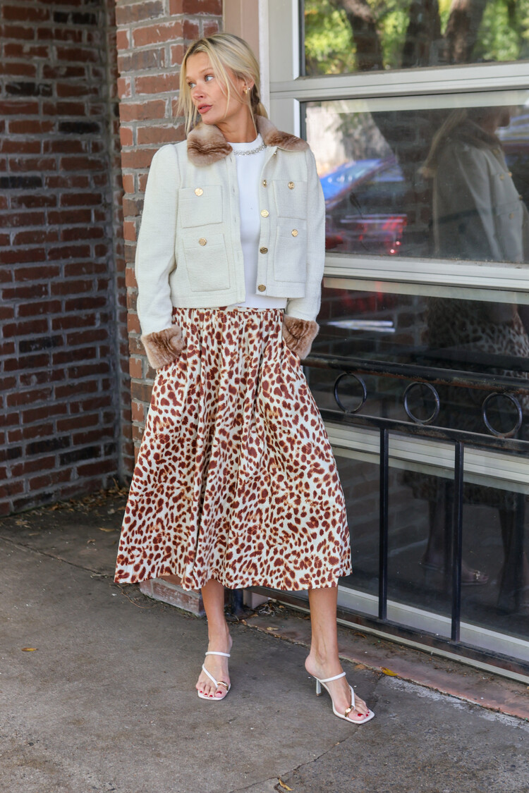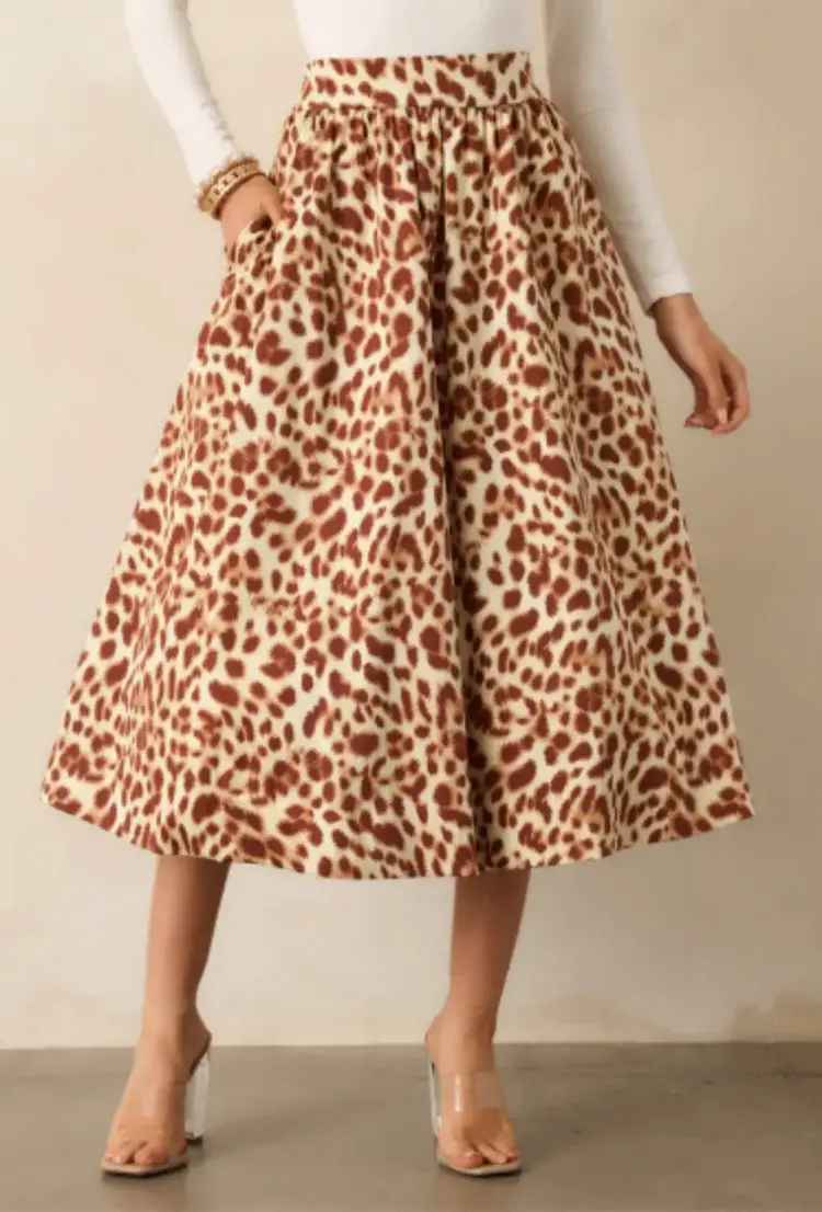 • The Erica Midi Skirt in Untamed print offers a refined balance of boldness and elegance. Crafted to flatter with its midi length, this skirt provides versatile styling options suitable for both professional and social settings.