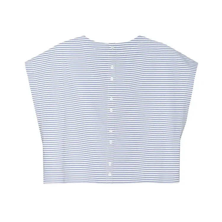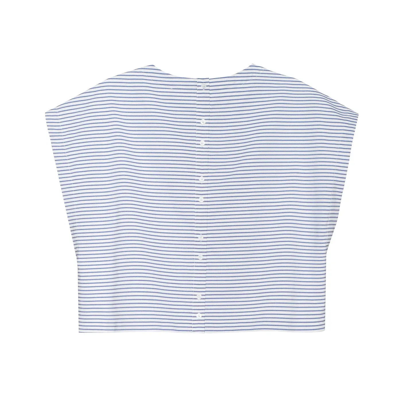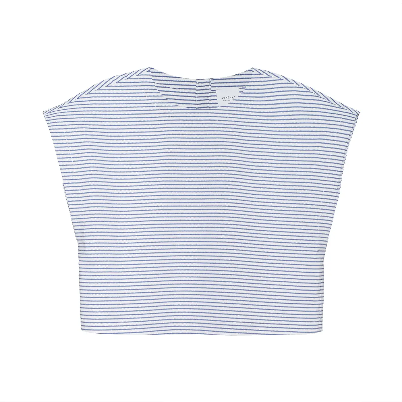 The Maya pant is made from 100% cotton poplin in a fresh navy stripe. This classic pull-on style features an easy drawstring waist and a wide leg silhouette that is slightly cropped.
