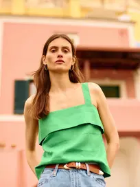 A tank that's both relaxed and refined, the Misti. Constructed in a mindful woven linen fabric, this wide strap tank includes a straight silhouette, layered chest panel detailing, and back zip hook and eye closure.