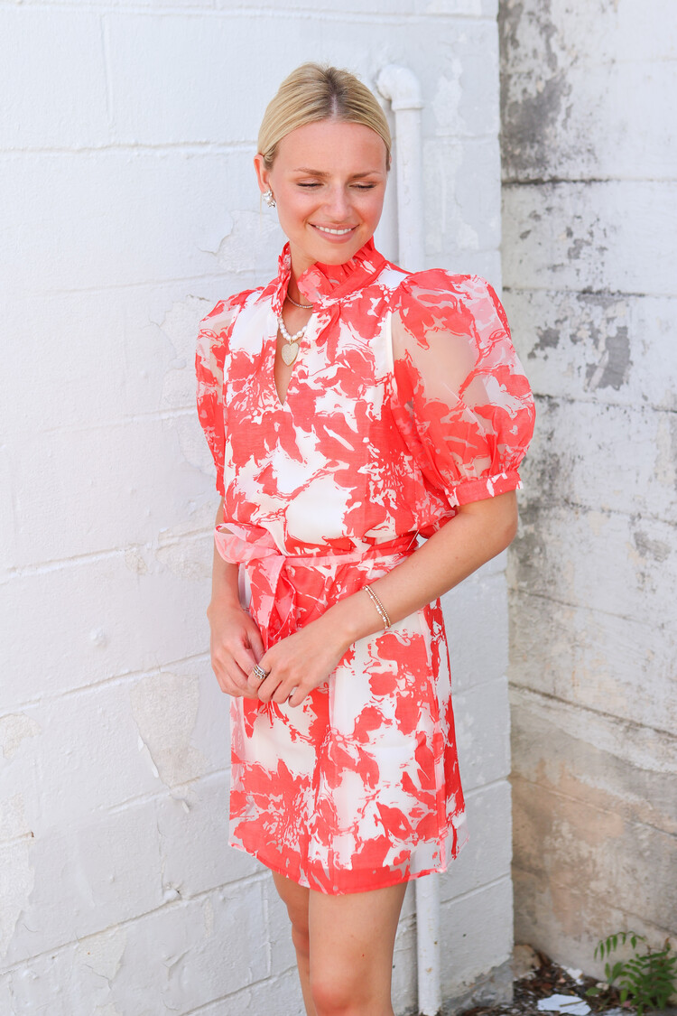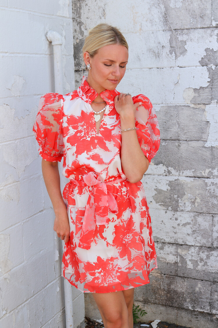 • A cute dress featuring a fun print, ruffle neck, puff sleeves, and a self tie optional belt!