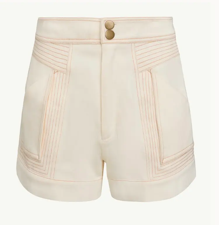 The Essie Short in cream is a polished warm-weather staple with a clean, structured feel. Designed with a high-waisted silhouette, it features a double-button front closure and crisp seam detailing that adds subtle dimension.