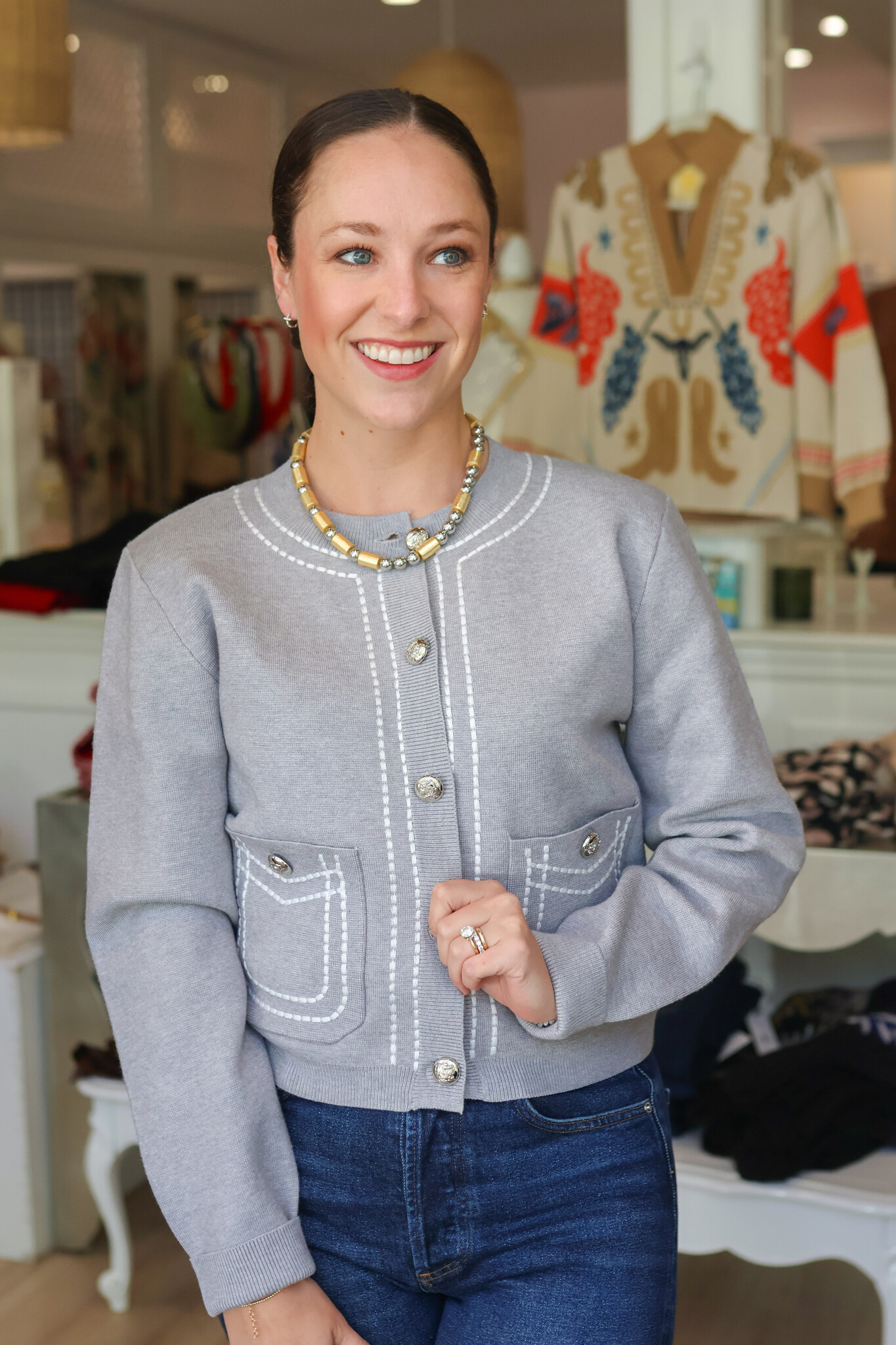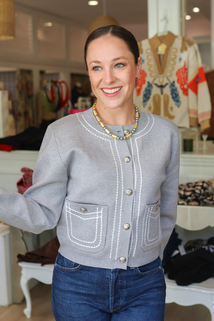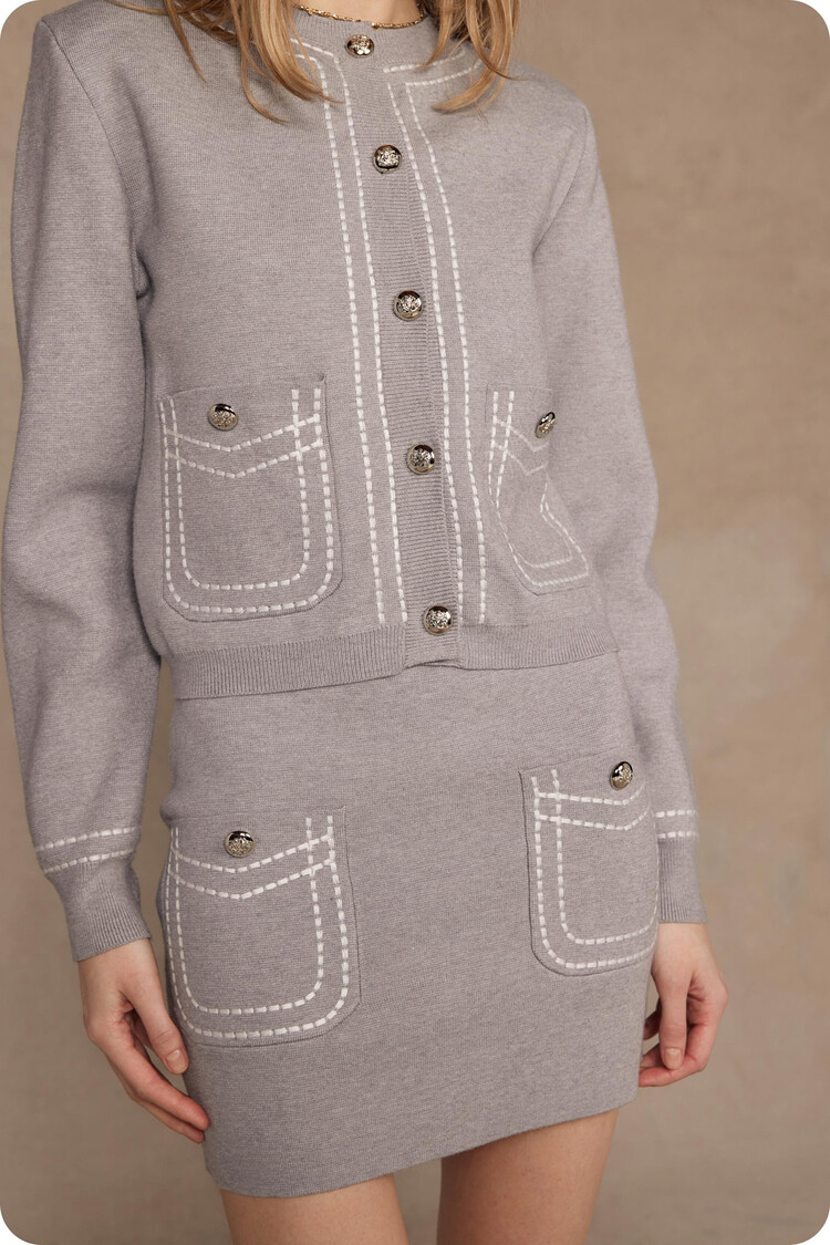• Thick stitch embroidery cardigan jacket in stretch knit fabric. This versatile knitted sweater cardigan features round ribbed neck, thick stitch embroidered detail throughout, long sleeves with ribbed cuff, front pockets, and button closure at front.