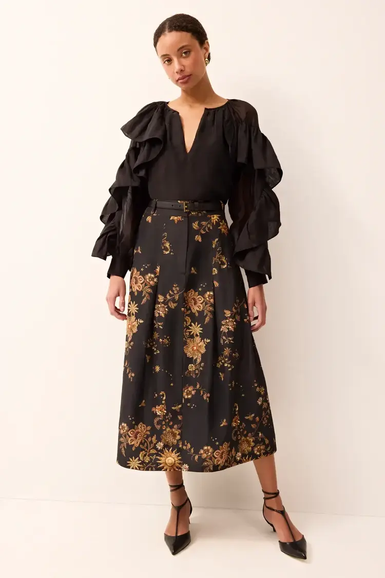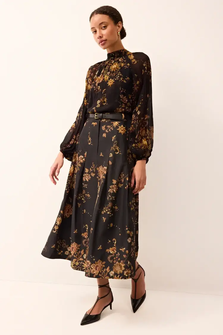• Faith is a tailored midi skirt defined by a fixed waistband and feminine box pleats that add movement and a slight flare. Shown here in our new Gilded print, a photorealistic celestial floral in black and gold.