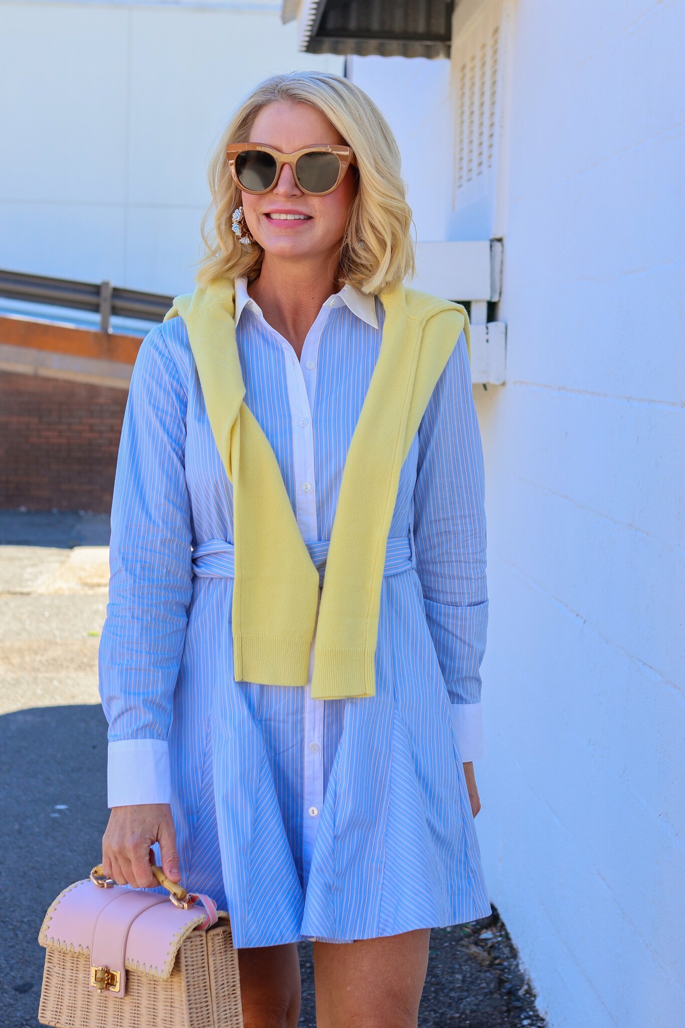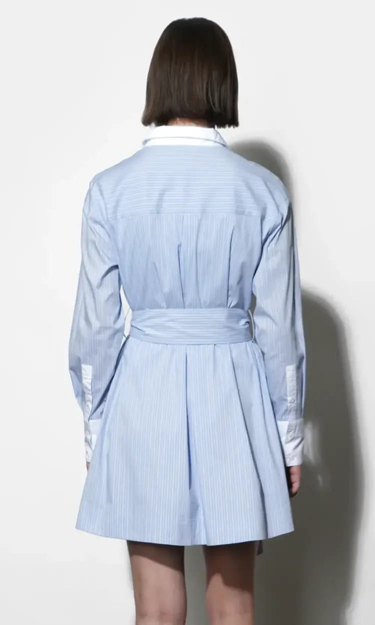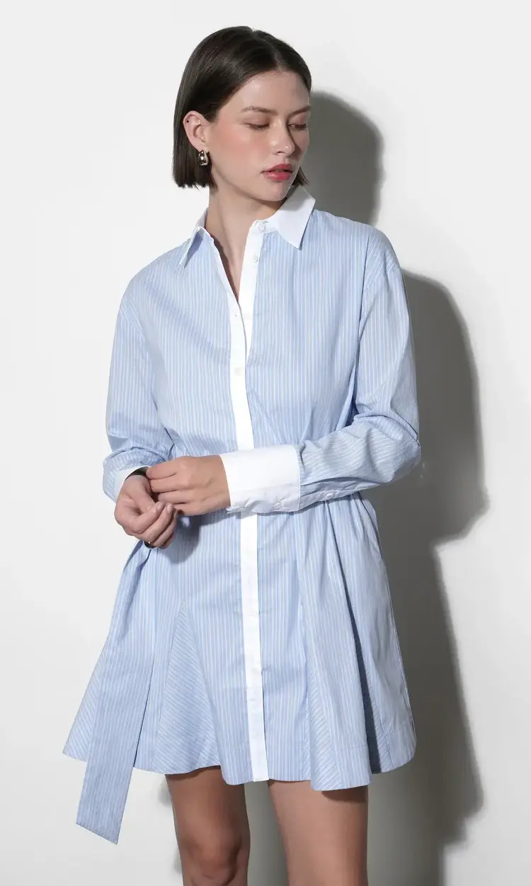 • While the top half maintains the structure of a classic shirt dress—complete with a sharp collar and button-down front—the skirt is elevated by godet pleats. These triangular fabric inserts add unexpected volume and a "swingy" flare to the mini-length hem