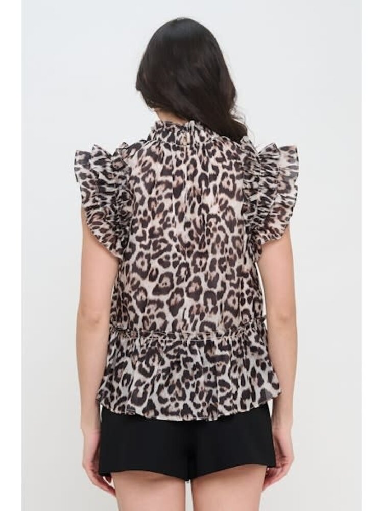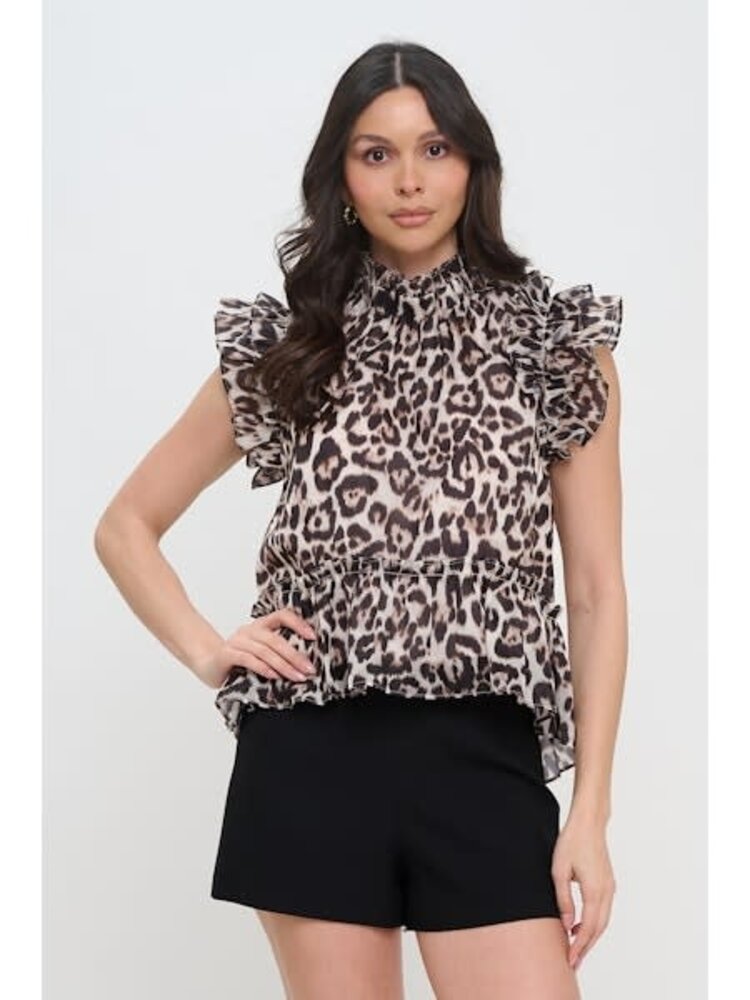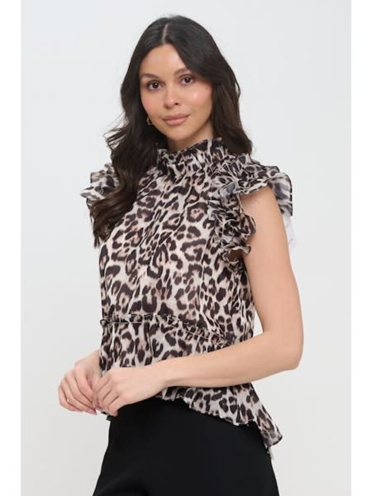 Featuring a bold cheetah print and delicate ruffle details, this top adds a touch of fierce femininity to any outfit. The high neckline offers a sophisticated silhouette, perfect for day-to-night looks.