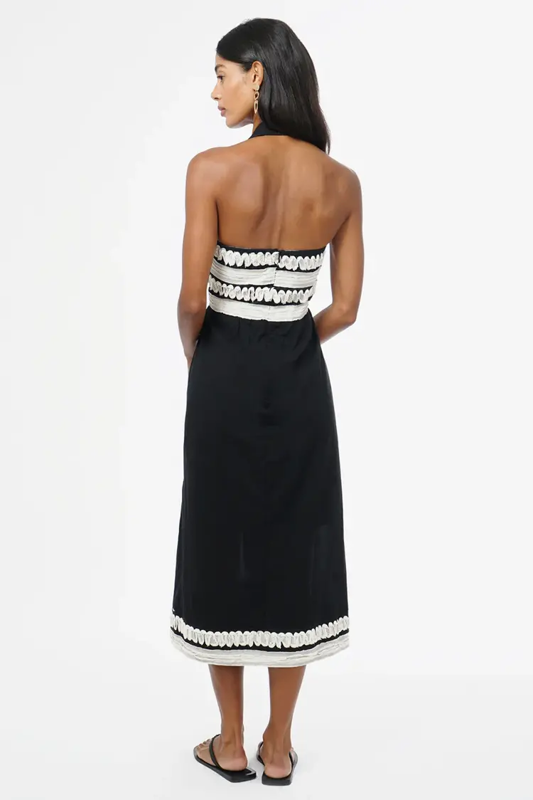 • The textured ribbon bodice features bold halter straps and a flattering neckline that frames the shoulders just right. A fitted waist flows into an airy A-line skirt, finished with matching ribbon trim that ties the whole look together.