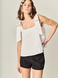 Contrast piping sleeveless pintuck blouse in a floral print on cotton poplin fabric. This style features contrast color piping at neckline/sleeve/hem, a classic split V neck with tie closure, ruffle cap sleeve, pin-tuck detail at front yoke, and lining.