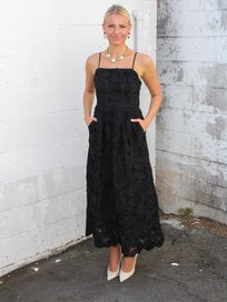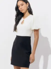 Featuring a fitted black skirt and a cream bodice with puff sleeves, this dress is finished with a white-trimmed neckline and keyhole cutout detail that adds a feminine, elevated touch. Its flattering silhouette makes it the perfect day-to-night piece.