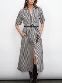 This elegant dress features timeless vertical stripes in a crisp color combination, offering a fresh and polished aesthetic. It is designed with a classic shirt collar, a full button-down front, and versatile long sleeves that can be styled up or down.
