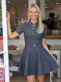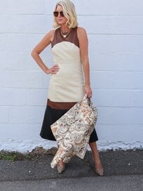 The sleeveless, high-neck silhouette is both elegant and bold, while the A-line skirt and cinched waist create a flattering and feminine shape. The Caspia dress is a fashion-forward piece that combines an edgy texture with a timeless design.