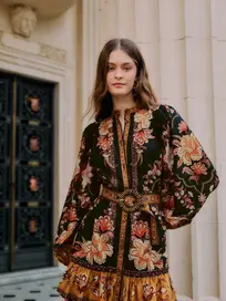 This floral pattern mini dress from FARM Rio, features a high neckline, long blouson sleeves, and a fitted silhouette that flares slightly at the hem, creating a graceful movement. A belt with beaded buckle, cinches the waist and finishes the look.