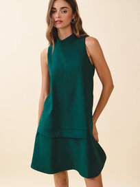 Button down detail bubble mini dress in faux leather and cotton poplin fabric. This sleeveless babydoll mini dress features bubble side panel in poplin fabric, faux leather bodice with button down detail, round neck, lining, and hidden zipper closure.