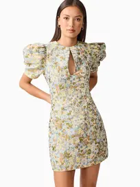 Make a vibrant statement with the Tasmin Puff Sleeve Dress, a playful yet sophisticated piece designed to turn heads. Crafted from a luxurious jacquard fabrication, this dress features an eye-catching floral pattern that radiates joyful energy and charm.