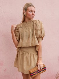 The Emery Dress is a vibrant mini that captures attention with its ziggy palm print. Featuring a relaxed silhouette with a gathered neckline and long sleeves, it balances playful prints with effortless elegance.