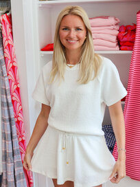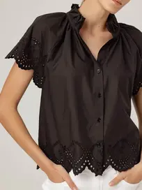 The Corinne Shirt features delicate ruffle detailing at the neckline and intricate embroidery along the scalloped hem and sleeves. The fit is relaxed through the body with the length sitting just at the top of the waistband of your favorite jeans.