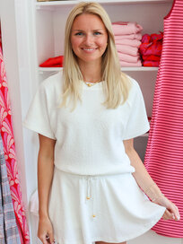 The Amory Dress is a relaxed-fit featuring a drawcord waist that allows for adjustable placement—wear it higher for a defined silhouette or lower for a more laid-back, drop-waist look. The open back adds a breezy touch while still remaining bra-friendly.