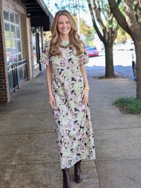 The Gwenyth Dress features a straight silhouette with a midi length and a discreet back slit, providing ease of movement and comfort. Its short sleeves and round neckline make it suitable for casual wear or elevated occasions like a date night.