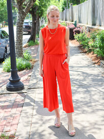 The summery silhouette is pictured here in our large scale Primavera floral, a watercolor-like motif that’s printed on a cotton organza and then hand embroidered with bright orange thread by local artisans in India to give texture and depth to the fabric.