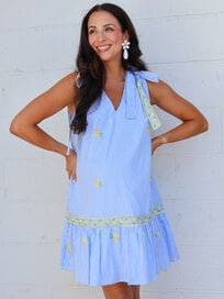 Studio Strut and Bolt Collection. Bow strap detail mini dress in a lemon embroidered stripe cotton poplin fabric. This drop waist mini dress features all over lemon embroidery, bow tie detail at shoulders, a classic V neck, side pockets, and lining.