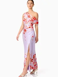 A striking one-shoulder maxi dress crafted in a luxurious purple and red printed satin. The gown showcases an elegant asymmetrical neckline, with delicate tucks gathered at the shoulder, adding dimension and sophistication to the design.