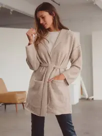 This belted hooded cardigan in oatmeal heather features a relaxed, open-front silhouette with wide sleeves and front patch pockets for effortless layering. The soft knit texture and self-tie waist add cozy structure to this casual yet polished piece.