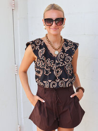 Brighten up your wardrobe with the Pleated Top, a playful must-have for summer outings and weekend brunches. Featuring a peach and pink print, this lightweight crop top is designed with a flattering surplice neckline, pleated bodice, and cap sleeves.