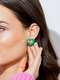 Introducing our fun, colorful, enamel heart earrings in 2 fun color ways. Pink with pink stone and Kelly Green with pink stone. 18k gold plated stainless steel post making them tarnish free, waterproof and hypoallergenic.