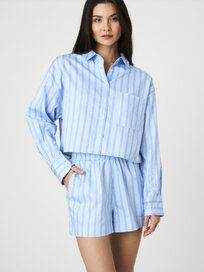 Not your boyfriend's boxer shorts. The Lorenzo Stripe Shorts feature a blue and pink pinstripe with an elastic waistband and functional pockets (because obviously). Pair them with the matching Lorenzo Stripe Cropped Shirt