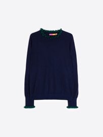 Navy sweater crafted in lightweight knit with green ruffle detail on the neckline and sleeve cuffs. Straight hem, regular fit and soft texture. Ideal for autumn-winter layering and everyday wear. Soft, lightweight texture in wool blend fabric.