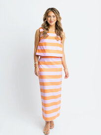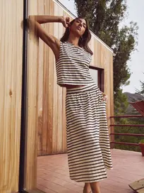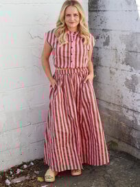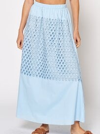 The Tiered Maxi Skirt in Americano brings bold, patriotic fashion to summer styling. Crafted in crisp cotton poplin, its color-blocked tiers create playful movement and volume, while the elastic waistband offers a comfortable, figure-flattering fit.